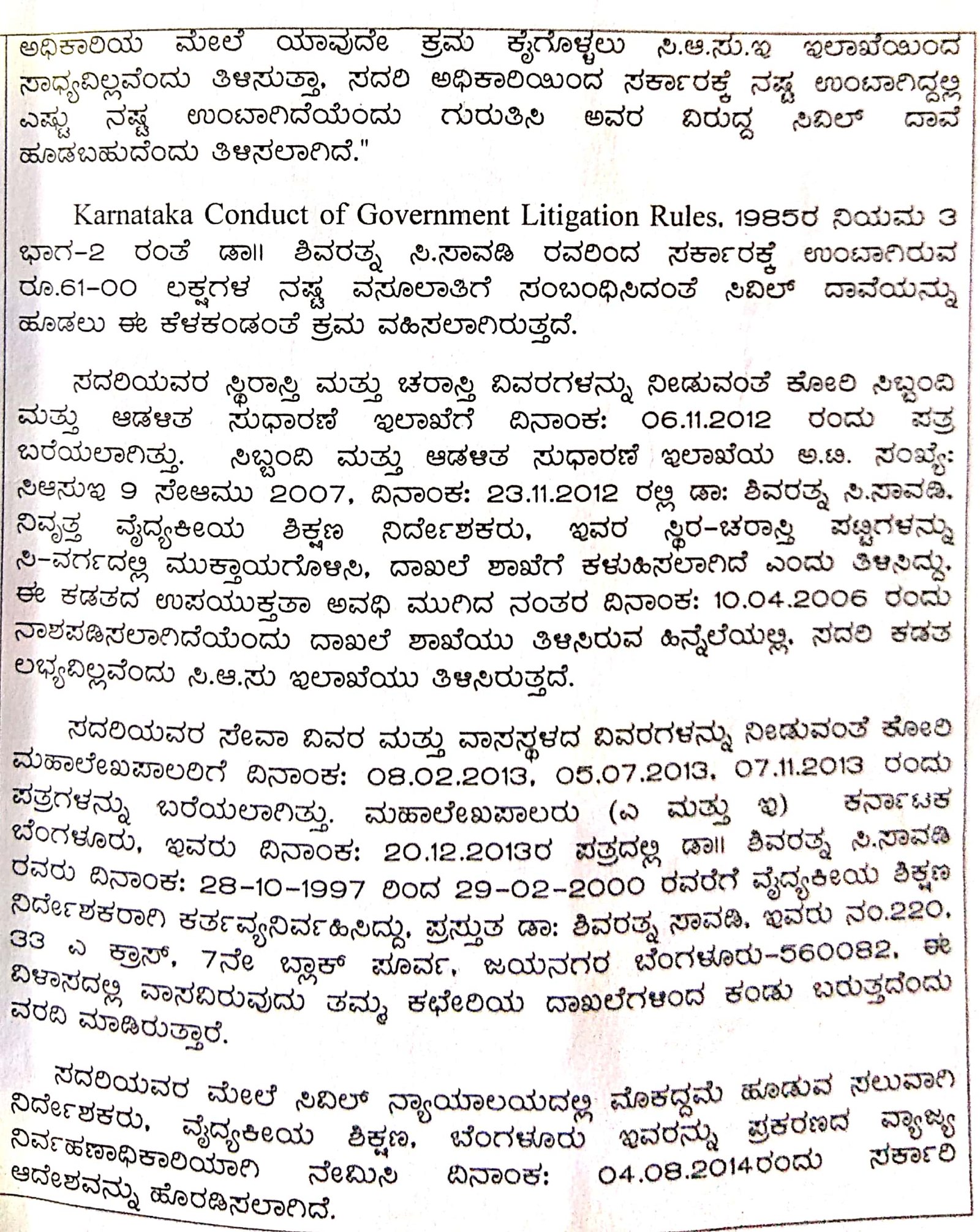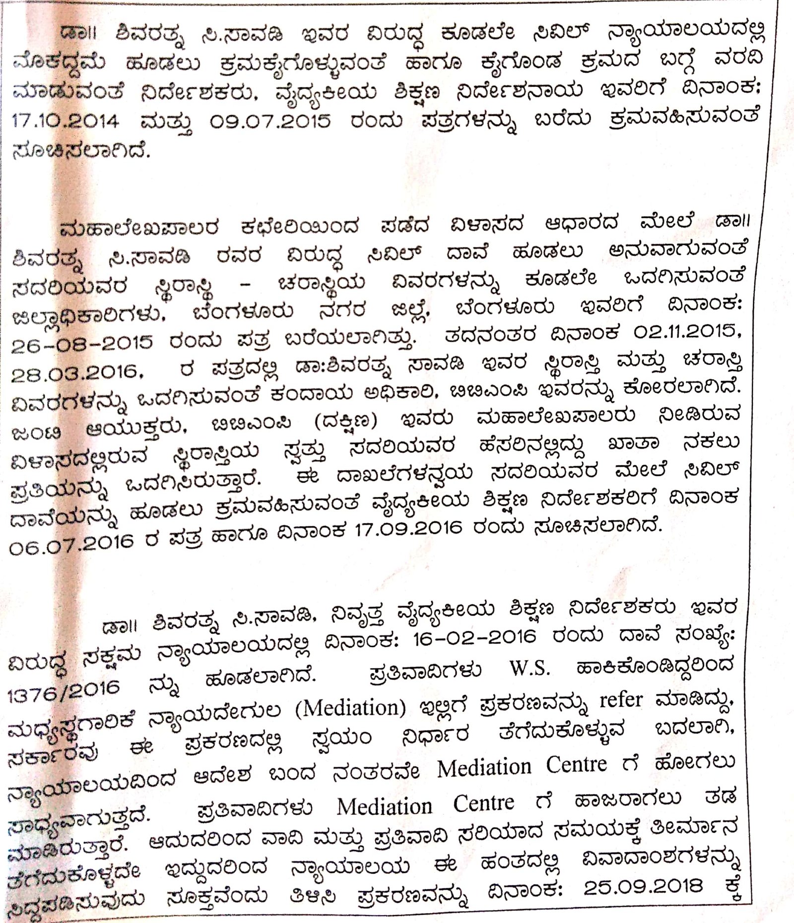 ಈಗಾಗಲೇ ನಿವೃತ್ತಿಯಾಗಿರುವ ಆಪಾದಿತ ಅಧಿಕಾರಿ ಡಾ ಶಿವರತ್ನ ಸಿ ಸಾವಡಿ ಅವರು ಪ್ರಕರಣ ಸಂಬಂಧ ಮಧ್ಯಸ್ಥಿಕೆ ಕೇಂದ್ರದಲ್ಲಿ ಅರ್ಜಿ ಸಲ್ಲಿಸಿದ್ದಾರೆ. ಹೀಗಾಗಿ ಸರ್ಕಾರ ಈ ಪ್ರಕರಣದಲ್ಲಿ ಸ್ವಯಂ ನಿರ್ಧಾರ ಕೈಗೊಂಡಿಲ್ಲ. ಆದರೆ ಪ್ರತಿವಾದಿಗಳು ಮಧ್ಯಸ್ಥಿಕೆ ಕೇಂದ್ರಕ್ಕೆ ಹಾಜರಾಗುವಲ್ಲಿ ತಡ ಮಾಡಿರುವ ಕಾರಣ ನ್ಯಾಯಾಲಯದ ಆದೇಶಕ್ಕಾಗಿ ಸರ್ಕಾರ ಎದುರು ನೋಡುತ್ತಿರುವುದು ಉತ್ತರದಿಂದ ಗೊತ್ತಾಗಿದೆ.