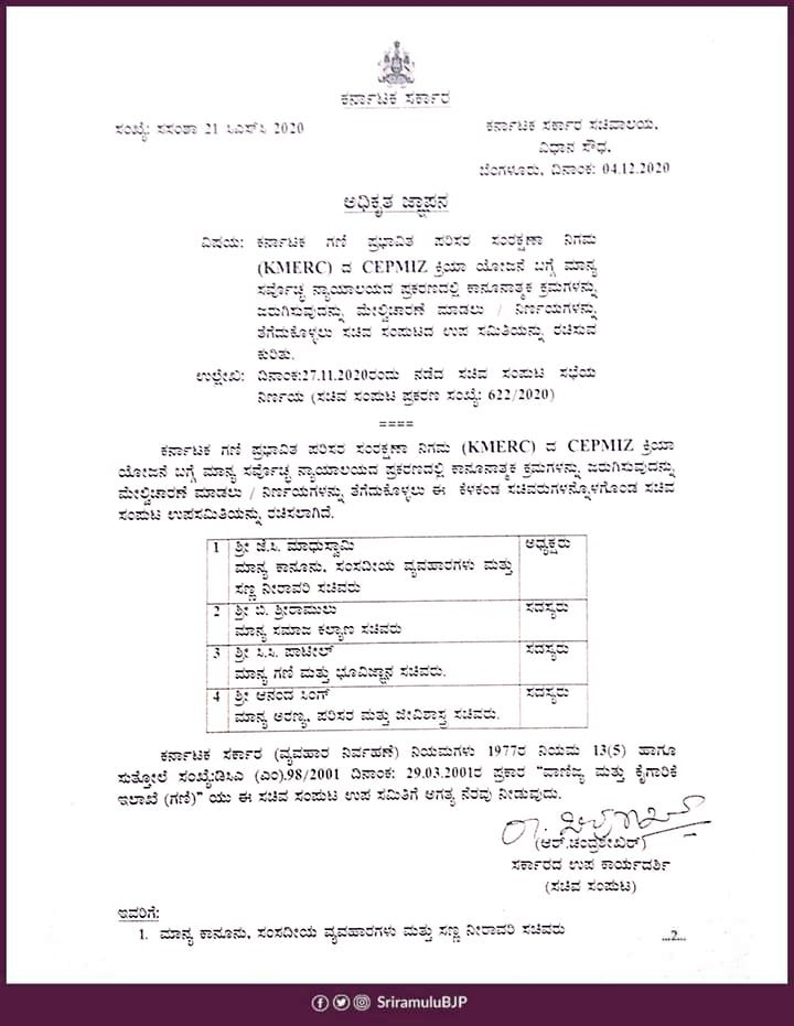 ಕಾನೂನು ಸಚಿವ ಜೆ ಸಿ ಮಾಧುಸ್ವಾಮಿ ಅಧ್ಯಕ್ಷತೆಯಲ್ಲಿ ರಚನೆಯಾಗಿರುವ ಸಚಿವ ಸಂಪುಟದ ಉಪ ಸಮಿತಿಯಲ್ಲಿ ಆನಂದ್ಸಿಂಗ್, ಶ್ರೀರಾಮುಲು ಮತ್ತು ಗಣಿ ಸಚಿವ ಸಿ ಸಿ ಪಾಟೀಲ್ ಅವರನ್ನು ನೇಮಿಸಿ 2020 ಡಿಸೆಂಬರ್ 4ರಂದು ಆದೇಶ ಹೊರಡಿಸಲಾಗಿದೆ. ಈ ಆದೇಶದ ಪ್ರತಿ ‘ದಿ ಫೈಲ್’ಗೆ ಲಭ್ಯವಾಗಿದೆ.