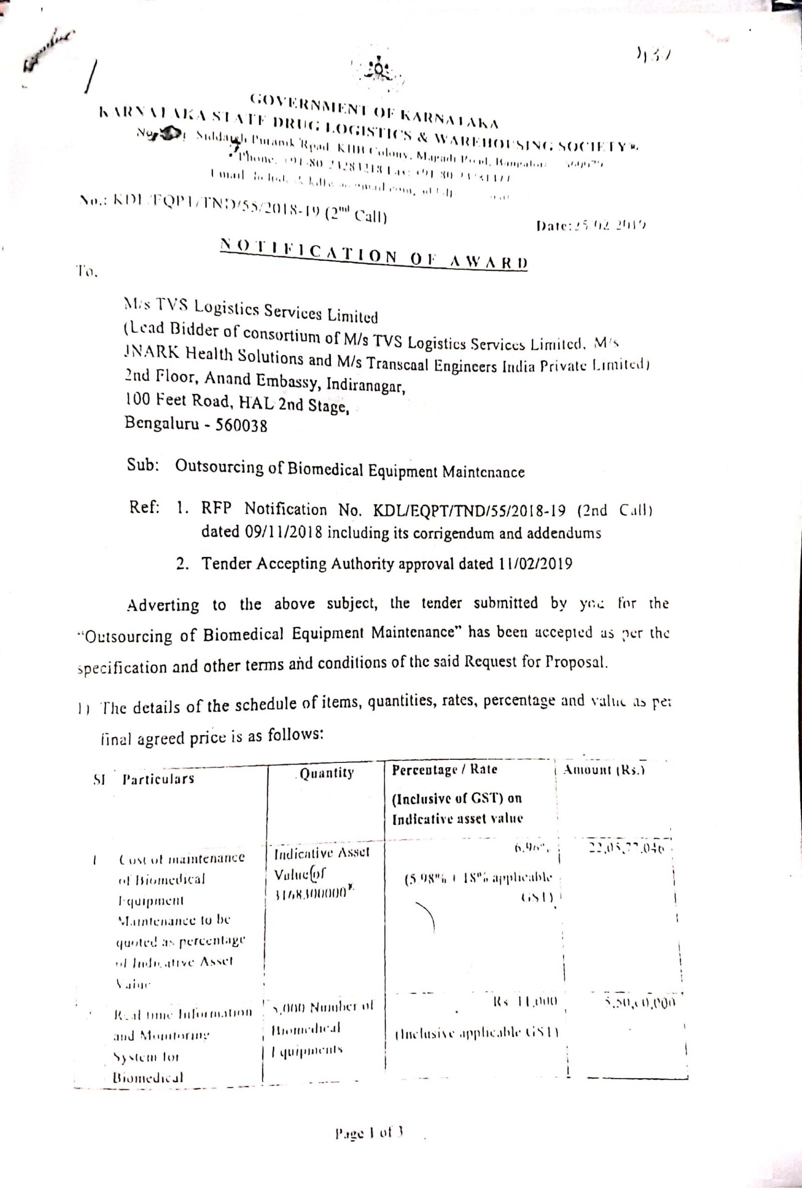 ಬಿಡ್ದಾರರು 3 ವರ್ಷಗಳ ಅವಧಿಗೆ ಉಪಕರಣಗಳ ನಿರ್ವಹಣೆಗೆ ದರವನ್ನು ಸೂಚಿಸಬೇಕು. ಪ್ರತಿ ವರ್ಷದ ಆಸ್ತಿ ಮೌಲ್ಯದ ಆಧಾರದ ಮೇಲೆ ಪ್ರತಿಯೊಂದು ವರ್ಷಕ್ಕೆ ಲೆಕ್ಕ ಹಾಕಿ, 3 ವರ್ಷದ ಮೌಲ್ಯವನ್ನು ಕೂಡಿಸಿ 3 ವರ್ಷಕ್ಕೂ ಬಯೋ ಮೆಡಿಕಲ್ ಉಪಕರಣದ ನಿರ್ವಹಣೆಯ ಒಟ್ಟು ಮೌಲ್ಯವನ್ನು ಇ-ಸಂಗ್ರಹಣಾ ವೇದಿಕೆಯಲ್ಲಿ ನಮೂದಿಸಬೇಕಿತ್ತು. ಆದರೆ ಕಂಪನಿಯು 3 ವರ್ಷಗಳ ಅವಧಿಗೆ ಉಪಕರಣಗಳ ನಿರ್ವಹಣೆಗೆ 22.06 ಕೋಟಿ ಮತ್ತು 3 ವರ್ಷಗಳ ಅವಧಿಯ ಮೇಲ್ವಿಚಾರಣೆಗೆ 5.5 ಕೋಟಿ ಸೇರಿ ಒಟ್ಟು 27.72 ಕೋಟಿ ದರ ನಮೂದಿಸಿತ್ತು. ಬಿಡ್ದಾರರು 3 ವರ್ಷಗಳ ಉಪಕರಣ ನಿರ್ವಹಣೆಗೆ ಸರಿಯಾದ ದರವನ್ನೇ ನಮೂದಿಸಿದ್ದರು ಎಂಬುದು ಸ್ಪಷ್ಟವಾಗುತ್ತದೆ.