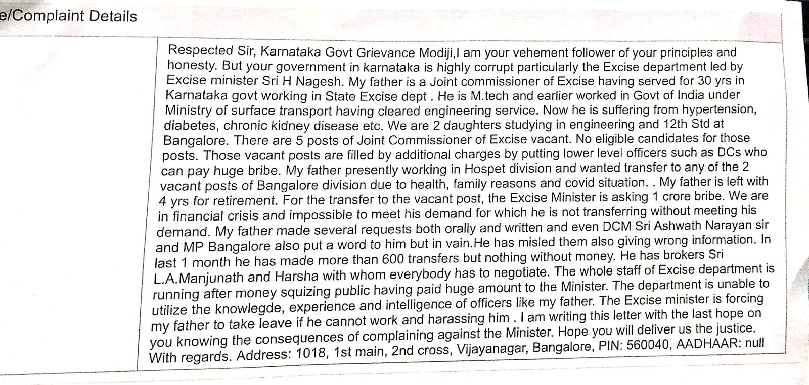 ಪ್ರಧಾನಿ ನರೇಂದ್ರ ಮೋದಿ ಅವರನ್ನು ಉದ್ದೇಶಿಸಿ ಬರೆದಿರುವ ಪತ್ರದಲ್ಲಿ ‘ಕರ್ನಾಟಕದಲ್ಲಿರುವ ಬಿಜೆಪಿ ಸರ್ಕಾರ ಅತ್ಯಂತ ಭ್ರಷ್ಟಾಚಾರದಿಂದ ಕೂಡಿದೆ. ವಿಶೇಷವಾಗಿ ಅಬಕಾರಿ ಇಲಾಖೆಯ ಸಚಿವ ಎಚ್ ನಾಗೇಶ್ ಅವರು ಅತ್ಯಂತ ಭ್ರಷ್ಟರು. ನನ್ನ ತಂದೆ ಇಲಾಖೆಯಲ್ಲಿ 30 ವರ್ಷಗಳಿಂದ ಸೇವೆ ಸಲ್ಲಿಸಿದ್ದಾರೆ. ಇದಕ್ಕೂ ಮೊದಲು ಭಾರತ ಸರ್ಕಾರದ ಸಾರಿಗೆ ಇಲಾಖೆಯಲ್ಲಿ ಸೇವೆ ಸಲ್ಲಿಸಿದ್ದರು. ಸದ್ಯ ಅಬಕಾರಿ ಇಲಾಖೆಯಲ್ಲಿ ಜಂಟಿ ಆಯುಕ್ತರಾಗಿ ಕಾರ್ಯನಿರ್ವಹಿಸುತ್ತಿದ್ದು, ಹೈಪರ್ ಟೆನ್ಷನ್, ಸಕ್ಕರೆ , ಕಿಡ್ನಿ ಕಾಯಿಲೆಯಿಂದ ಬಳಲುತ್ತಿದ್ದಾರೆ. ನಮ್ಮ ತಂದೆಗೆ ಇಬ್ಬರು ಪುತ್ರಿಯರಿದ್ದು, ಒಬ್ಬರು ಇಂಜಿನಿಯರಿಂಗ್ ಮತ್ತೊಬ್ಬರು ಪಿಯುಸಿ ವ್ಯಾಸಂಗ ಮಾಡುತ್ತಿದ್ದೇವೆ. 5 ಜಂಟಿ ಆಯುಕ್ತರ ಹುದ್ದೆ ಖಾಲಿ ಇವೆ. ಈ ಹುದ್ದೆಗೆ ಅರ್ಹ ಅಭ್ಯರ್ಥಿಗಳಿಲ್ಲ. ನಮ್ಮ ತಂದೆ ಸದ್ಯ ಹೊಸಪೇಟೆ ವಿಭಾಗದಲ್ಲಿ ಕಾರ್ಯನಿರ್ವಹಿಸುತ್ತಿದ್ದು, ಅನಾರೋಗ್ಯ ಮತ್ತು ನಿವೃತ್ತಿ ಅಂಚಿನಲ್ಲಿರುವ ಕಾರಣ ಖಾಲಿ ಇದ್ದ ಹುದ್ದೆಗೆ ವರ್ಗಾವಣೆ ಮಾಡಲು ಕೋರಿದ್ದೆವು. ಆದರೆ ಸಚಿವ ಎಚ್ ನಾಗೇಶ್ ಅವರು 1 ಕೋಟಿ ಲಂಚಕ್ಕಾಗಿ ಬೇಡಿಕೆ ಇಟ್ಟಿದ್ದಾರೆ, ‘ ಎಂದು ಆರೋಪಿಸಿರುವುದು ದೂರಿನಿಂದ ತಿಳಿದು ಬಂದಿದೆ.