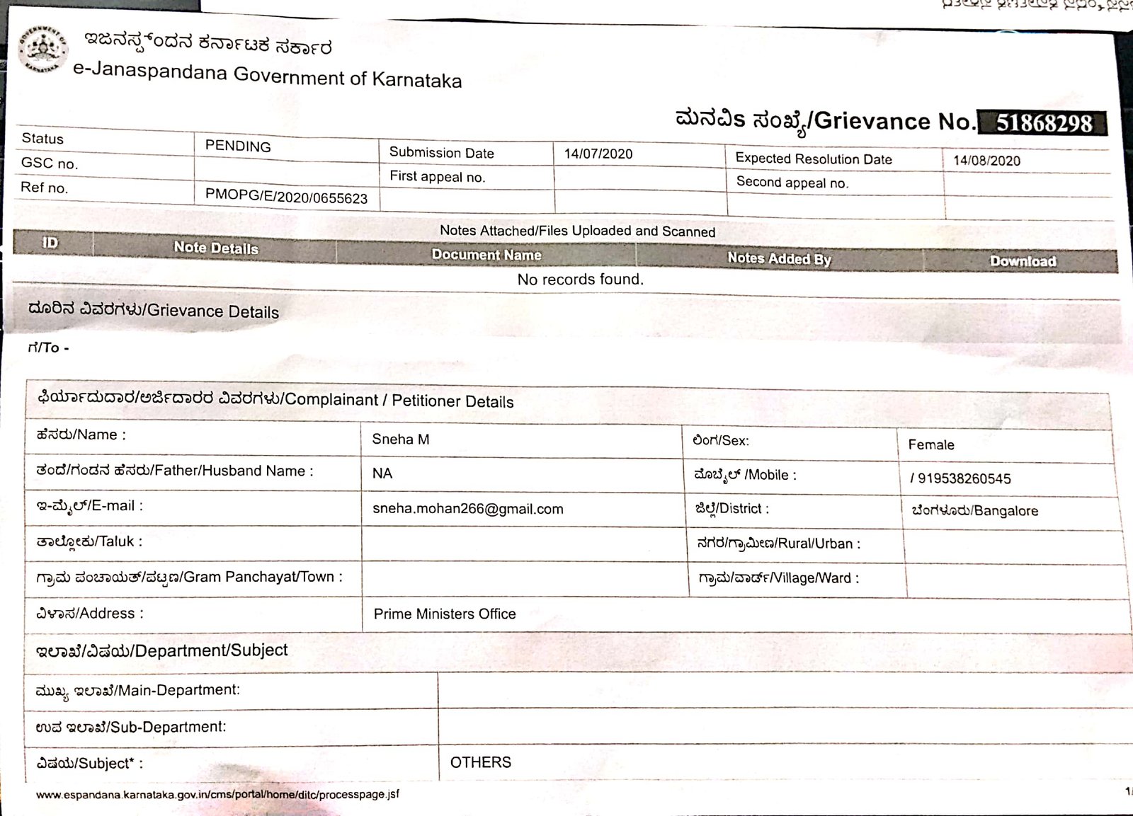 ಅನಾರೋಗ್ಯದಿಂದ ಬಳಲುತ್ತಿದ್ದ ಕಾರಣಕ್ಕೆ ಬೆಂಗಳೂರು ವೃತ್ತದಲ್ಲಿ ಖಾಲಿ ಇದ್ದ ಜಂಟಿ ಆಯುಕ್ತರ ಹುದ್ದೆಗೆ ಬರಲು ಇಚ್ಛಿಸಿದ್ದ ಅಧಿಕಾರಿಯಿಂದ 1 ಕೋಟಿ ಲಂಚ ಕೇಳಿದ್ದಾರೆ ಎಂದು ಸ್ವತಃ ಅಧಿಕಾರಿ ಪುತ್ರಿ ಪ್ರಧಾನಮಂತ್ರಿ ಕಚೇರಿಗೆ 2020ರ ಜುಲೈ 14ರಂದು ದೂರು ಸಲ್ಲಿಸಿದ್ದಾರೆ. ಅಲ್ಲದೇ ಅದೇ ದೂರನ್ನು (ದೂರಿನ ಸಂಖ್ಯೆ; 51868298) ಇ-ಜನಸ್ಪಂದನದಲ್ಲಿಯೂ ದಾಖಲಿಸಿದ್ದಾರೆ. ಸದ್ಯ ಹೊಸಪೇಟೆ ವಿಭಾಗದಲ್ಲಿ ಅಧಿಕಾರಿ ಕಾರ್ಯನಿರ್ವಹಿಸುತ್ತಿದ್ದಾರೆ. ಇ-ಜನಸ್ಪಂದನದಲ್ಲಿ ದಾಖಲಿಸಿರುವ ದೂರಿನ ಪ್ರತಿ ‘ದಿ ಫೈಲ್’ಗೆ ಲಭ್ಯವಾಗಿದೆ.