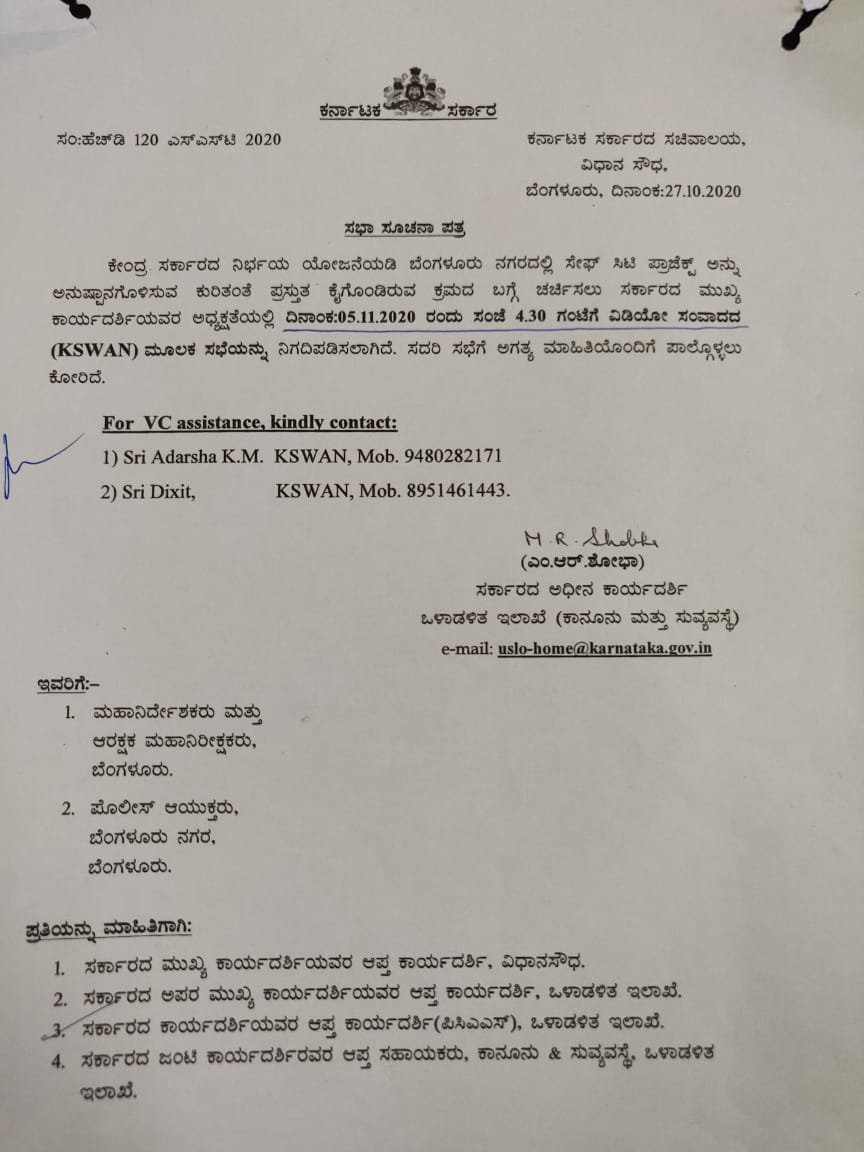 ಸೇಫ್ ಸಿಟಿ ಯೋಜನೆ ಅನುಷ್ಠಾನಗೊಳಿಸುವ ಕುರಿತಂತೆ ಕೆ ಸ್ವ್ಯಾನ್ 2020ರ ನವೆಂಬರ್ 5ರಂದು ಆಯೋಜಿಸಿದ್ದ ಸಭೆಗೆ ರಾಜ್ಯ ಗೃಹ ಕಾರ್ಯದರ್ಶಿ ರೂಪ ಮೌದ್ಗಿಲ್ ಅವರು ಭಾಗವಹಿಸುವಂತೆ ಸಭಾ ಸೂಚನಾ ಪತ್ರ ಕಳಿಸಲಾಗಿತ್ತು. ಇದೇ ಸಭೆಯಲ್ಲಿ ಪೊಲೀಸ್ ಮಹಾ ನಿರ್ದೇಶಕರು ಮತ್ತು ಬೆಂಗಳೂರು ನಗರದ ಪೊಲೀಸ್ ಆಯುಕ್ತರೂ ಭಾಗವಹಿಸಿದ್ದರು.