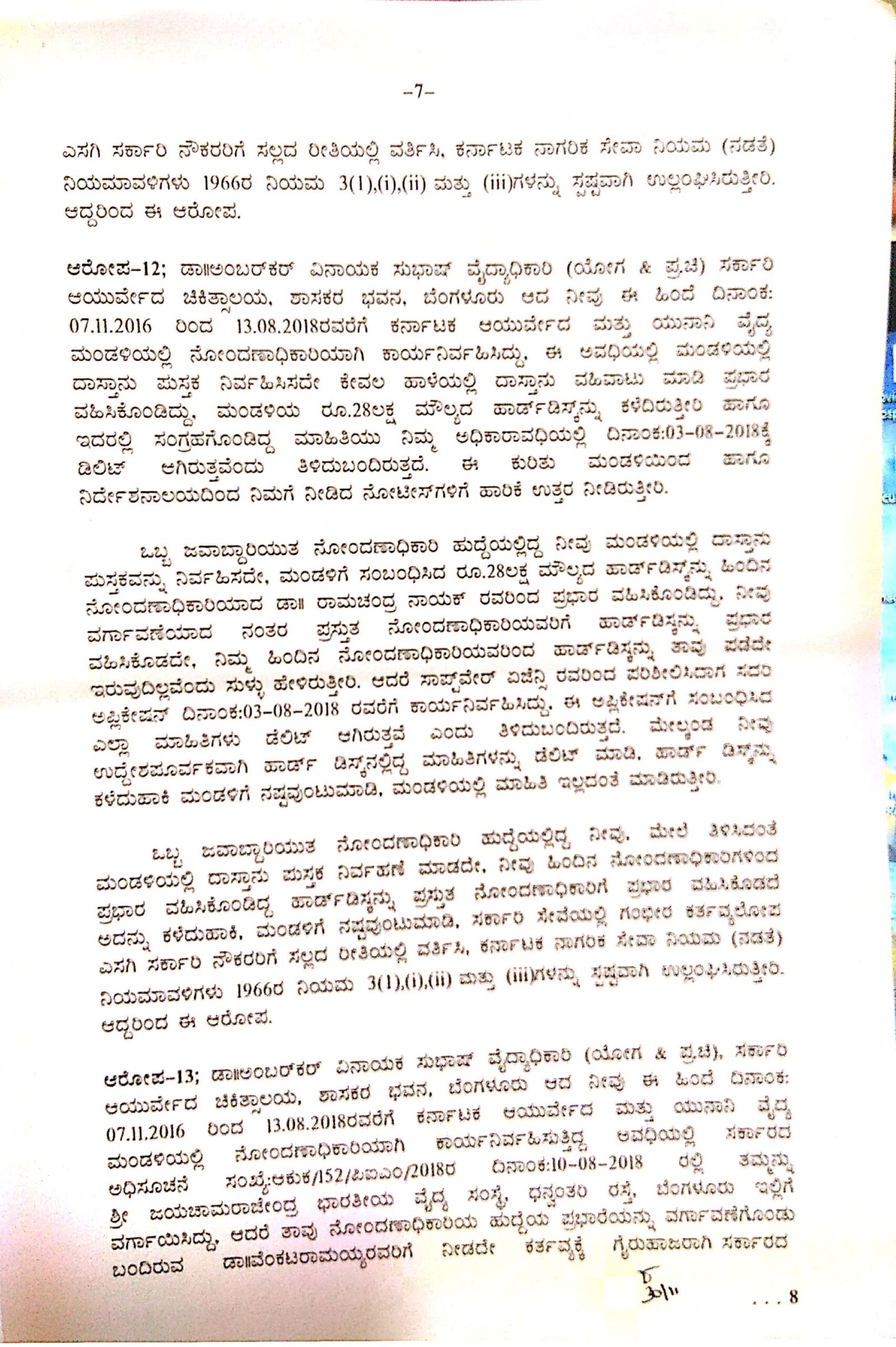 2016ರಿಂದ 2018ರವರೆಗೆ ಕರ್ನಾಟಕ ಆಯುರ್ವೇದ ಮತ್ತು ಯುನಾನಿ ವೈದ್ಯ ಮಂಡಳಿಯಲ್ಲಿ ನೋಂದಣಾಧಿಕಾರಿಯಾಗಿ ಕಾರ್ಯನಿರ್ವಹಿಸುತ್ತಿದ್ದ ಅವಧಿಯಲ್ಲಿ ಡಾ ಅಂಬರ್ಕರ್ ಅವರು 28 ಲಕ್ಷ ಮೌಲ್ಯದ ಹಾರ್ಡ್ಡಿಸ್ಕ್ನ್ನು ಕಳೆದಿರುತ್ತಾರೆ ಎಂಬುದು ದೋಷಾರೋಪಣೆ ಪಟ್ಟಿಯಿಂದ ಗೊತ್ತಾಗಿದೆ.