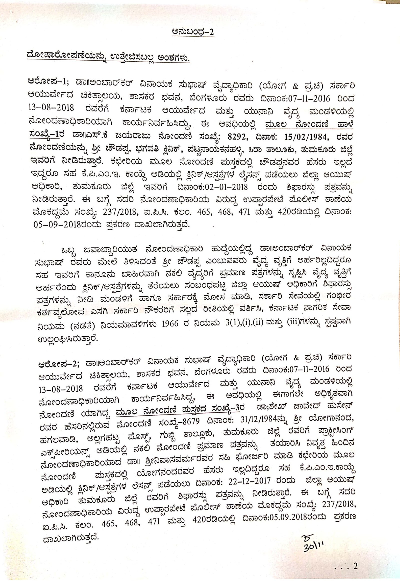 ಮಂಡಳಿಯಲ್ಲಿ ಈಗಾಗಲೇ ಡಾ ಎಸ್ ಕೆ ಜಯರಾಜ್ ಅವರ ಹೆಸರಿನಲ್ಲಿ ಅಧಿಕೃತವಾಗಿ ನೋಂದಣಿಯಾಗಿದ್ದ (ನೋಂದಣಿ ಸಂಖ್ಯೆ 8292) ಸಂಖ್ಯೆಯನ್ನು ಸಿರಾ ತಾಲೂಕಿನ ಪಟ್ಟನಾಯಕನಹಳ್ಳಿಯ ಭಗವತಿ ಕ್ಲಿನಿಕ್ನ ಚೌಡಪ್ಪ ಎಂಬುವರಿಗೆ ಪ್ರಾಕ್ಟೀಸಿಂಗ್ ಎಕ್ಸ್ಪೀರಿಯನ್ಸ್ ಅಡಿಯಲ್ಲಿ ನಕಲಿ ನೋಂದಣಿ ಪ್ರಮಾಣ ಪತ್ರ ನೀಡಿದ್ದರು. ಹಿಂದಿನ ನೋಂದಣಾಧಿಕಾರಿ ಡಾ ಶ್ರೀನಿವಾಸವರ್ಮ ಅವರ ಸಹಿ ಫೋರ್ಜರಿ ಮಾಡಿದ್ದರು. ಕಚೇರಿಯ ಮೂಲ ನೋಂದಣಿ ಪುಸ್ತಕದಲ್ಲಿ ಚೌಡಪ್ಪ ಎಂಬುವರ ಹೆಸರಿಲ್ಲದಿದ್ದರೂ ಸಹ ಕೆಪಿಎಂಂಇ ಕಾಯ್ದೆ ಅಡಿಯಲ್ಲಿ ಕ್ಲಿನಿಕ್/ಆಸ್ಪತ್ರೆ ಲೈಸೆನ್ಸ್ ಪಡೆಯಲು ತುಮಕೂರು ಜಿಲ್ಲಾ ಆಯುಷ್ ಅಧಿಕಾರಿಗೆ ಶಿಫಾರಸ್ಸು ಪತ್ರ ನೀಡಿದ್ದರು ಎಂದು ದೋಷಾರೋಪಣೆ ಪಟ್ಟಿಯಲ್ಲಿ ವಿವರಿಸಲಾಗಿದೆ.