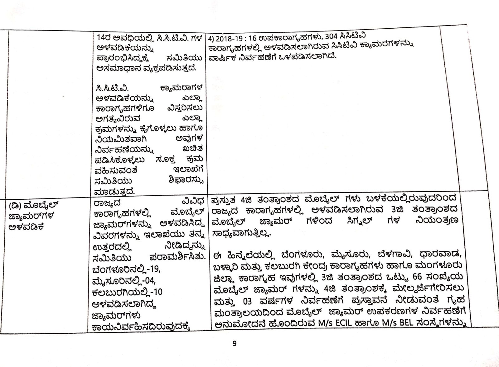 ‘4 ಜಿ ತಂತ್ರಾಂಶದ ಮೊಬೈಲ್‌ಗಳು ಬಳಕೆಯಲ್ಲಿರುವುದರಿಂದ ರಾಜ್ಯದ ಕಾರಾಗೃಹಗಳಲ್ಲಿ ಅಳವಡಿಸಲಾಗಿರುವ 3 ಜಿ ತಂತ್ರಾಂಶದ ಮೊಬೈಲ್‌ ಜ್ಯಾಮರ್‌ಗಳಿಂದ ಸಿಗ್ನಲ್‌ಗಳ ನಿಯಂತ್ರಣ ಸಾಧ್ಯವಾಗುತ್ತಿಲ್ಲ,’ ಎಂಬುದು ವರದಿಯಲ್ಲಿ ವಿವರಿಸಲಾಗಿದೆ.