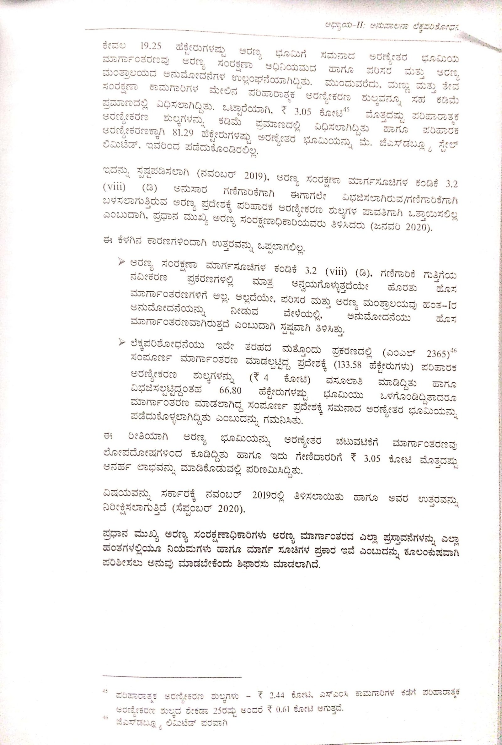 ಅಲ್ಲದೆ ವಿಭಜಿಸಲ್ಪಟ್ಟಿದ್ದ 66.80 ಹೆಕ್ಟೇರ್ ಪ್ರದೇಶವೂ ಇದರಲ್ಲಿ ಒಳಗೊಂಡಿತ್ತಾದರೂ ಮಾರ್ಗಾಂತರವಾಗಿದ್ದ ಸಂಪೂರ್ಣ ಪ್ರದೇಶಕ್ಕೆ ಸಮನಾದ ಅರಣ್ಯೇತರ ಭೂಮಿಯನ್ನು ಪಡೆದುಕೊಂಡಿತ್ತು ಎಂದು ಸಿಎಜಿ ವರದಿ ತಿಳಿಸಿದೆ.
