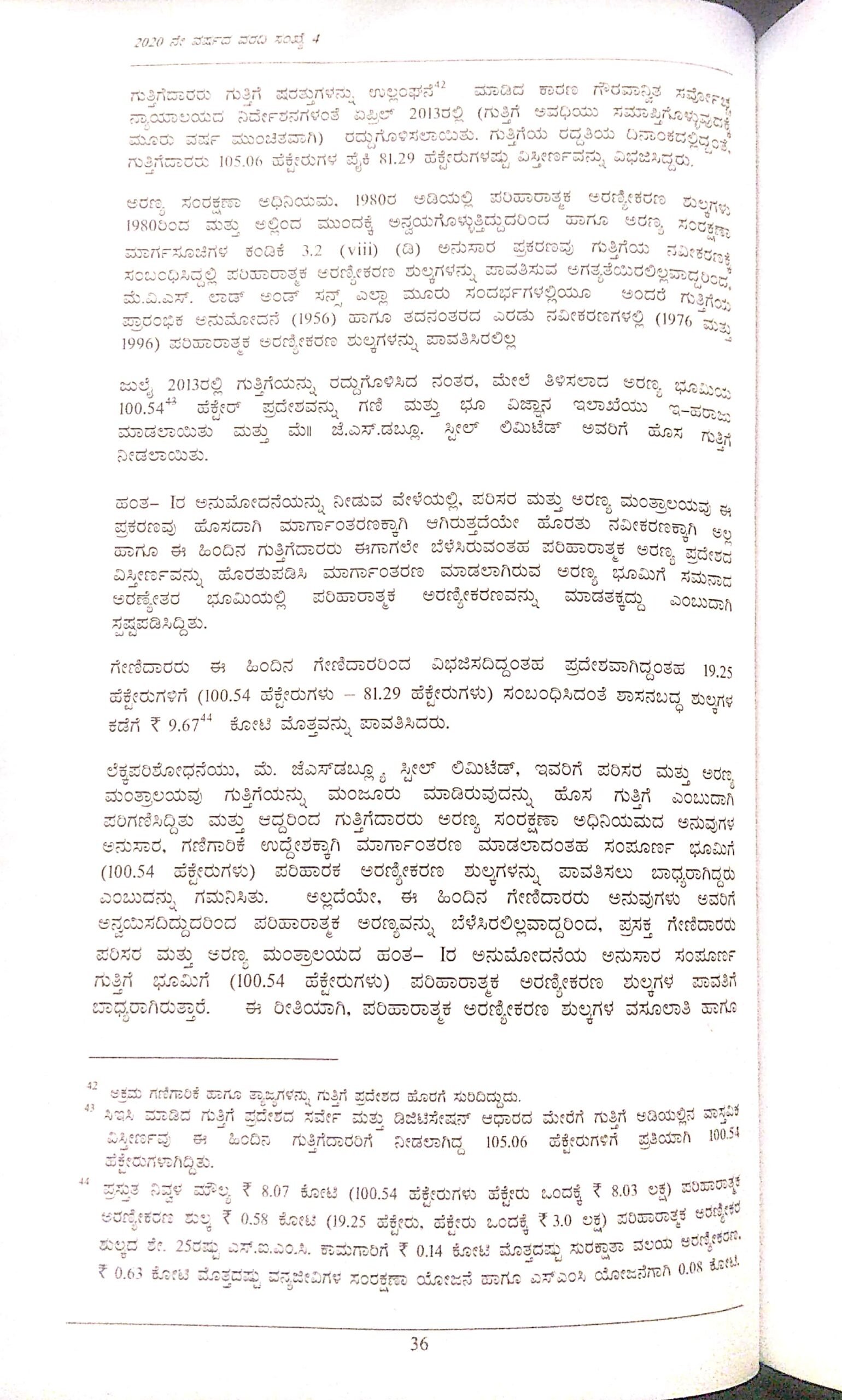 ಹಾಗೆಯೇ ಜಿಎಸ್ಡಬ್ಲ್ಯೂ ಸ್ಟೀಲ್ನ ಮತ್ತೊಂದು ಪ್ರಕರಣದಲ್ಲಿ (ಎಂ ಎಲ್ 2365) ಸಂಪೂರ್ಣ ಮಾರ್ಗಾಂತರಣವಾಗಿದ್ದ 133.58 ಹೆಕ್ಟೇರ್ ಪ್ರದೇಶಕ್ಕೆ 4.00 ಕೋಟಿ ಪರಿಹಾರಾತ್ಮಕ ಅರಣ್ಯೀಕರಣ ಶುಲ್ಕ ಪಡೆದಿತ್ತು.