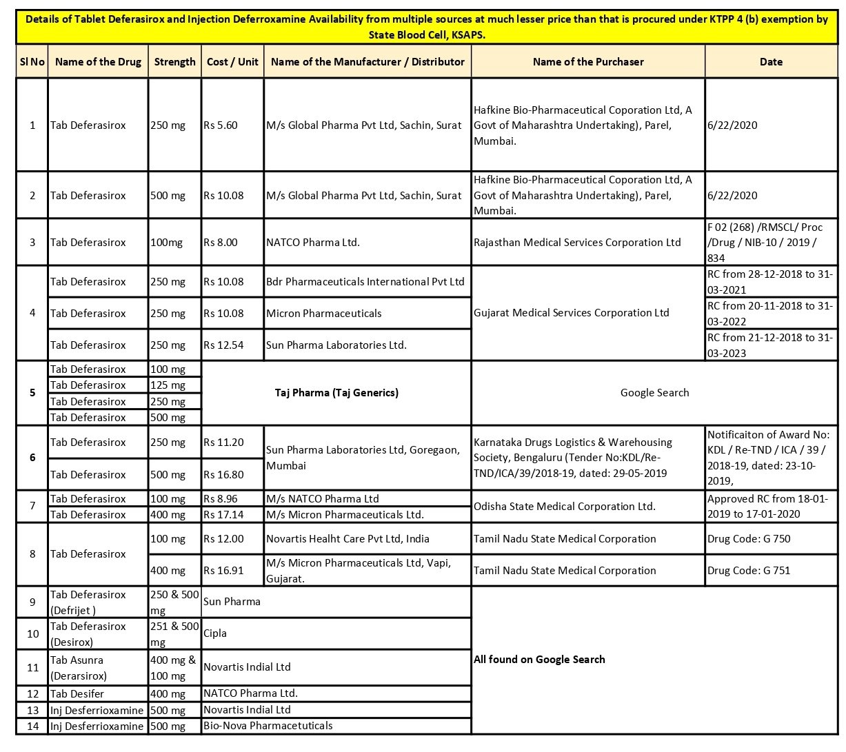 ಡಾ ಬಣಕರ್ ಅವಧಿಯಲ್ಲಿ ಕಬ್ಬಿಣಾಂಶ ಮಾತ್ರೆ (100 ಎಂಜಿ)ಗೆ 21.09 ರು ಮತ್ತು ಡಿಫೆರ್ಕ್ಸೋಮೈನ್ ಇಂಜಕ್ಷನ್ಗೆ 155.40 ರು. ದರದಲ್ಲಿ ಆಸ್ಕೋ ಏಜೆನ್ಸಿಯಿಂದ ಖರೀದಿಸಲಾಗಿದೆ. ಆದರೆ ಇವೇ ಔಷಧಗಳಿಗೆ ಮಾರುಕಟ್ಟೆಯಲ್ಲಿ ಕಡಿಮೆ ದರದಲ್ಲಿ ದೊರೆಯುತ್ತಿದ್ದವು. ಸೂರತ್ನ ಗ್ಲೋಬಲ್ ಫಾರ್ಮಾ ಪ್ರೈವೈಟ್ ಲಿಮಿಟೆಡ್ ಟ್ಯಾಬ್ ಡಿಫರೋಕ್ಸ್ (250 ಎಂಜಿ) 5.60 ರು., ನಿಗದಿಪಡಿಸಿತ್ತು. ಹಾಗೆಯೇ ರಾಜಸ್ಥಾನ ಮೆಡಿಕಲ್ ಕಾರ್ಪೋರೇಷನ್ ನ್ಯಾಟ್ಕೋ ಫಾರ್ಮಾ ಲಿಮಿಟೆಡ್ನಿಂದ 10.08 ರು. ದರದಲ್ಲಿ (500 ಎಂಜಿ) ಖರೀದಿಸಿದೆ. ಅದೇ ರೀತಿ ಗುಜರಾತ್ ಮೆಡಿಕಲ್ ಕಾರ್ಪೋರೇಷನ್ ಬಿಡಿಆರ್ ಫಾರ್ಮಾಸ್ಯುಟಿಕಲ್ಸ್ ಇಂಟರ್ನ್ಯಾಷನಲ್ ಪ್ರೈವೈಟ್ ಲಿಮಿಟೆಡ್, ಮೈಕ್ರಾನ್ ಫಾರ್ಮಾಸ್ಯುಟಿಕಲ್ಸ್,ನಿಂದ 10.08 ರು.ದರದಲ್ಲಿ (250 ಎಂಜಿ) ಖರೀದಿಸಿದ್ದರೆ ಸನ್ ಫಾರ್ಮಾ ಲ್ಯಾಬೋರೇಟರಿಸ್ನಿಂದ 12.54 ರು.ದರದಲ್ಲಿ ಖರೀದಿಸಿತ್ತು. ಹಾಗೆಯೆ ಒಡಿಶಾ ಮೆಡಿಕಲ್ ಕಾರ್ಪೋರೇಷನ್ ಮೈಕ್ರಾನ್ ಫಾರ್ಮಾಸ್ಯುಟಿಕಲ್ಸ್ನಿಂದ 17.14 ರು. , ನ್ಯಾಟ್ಕೋ ಫಾರ್ಮಾ ಲಿಮಿಟೆಡ್ನಿಂದ 8.96 ರು. ದರದಲ್ಲಿ, ತಮಿಳುನಾಡು ಮೆಡಿಕಲ್ ಕಾರ್ಪೋರೇಷನ್ ನೊವಾರ್ಟಿಸ್ ಹೆಲ್ತ್ ಕೇರ್ ಪ್ರೈವೈಟ್ ಲಿಮಿಟೆಡ್ನಿಂದ 12.00 ರು., ಮೈಕ್ರಾನ್ ಫಾರ್ಮಾಸ್ಯುಟಿಕಲ್ಸ್ನಿಂದ 16.91 ರು. ದರದಲ್ಲಿ ಖರೀದಿಸಿತ್ತು.