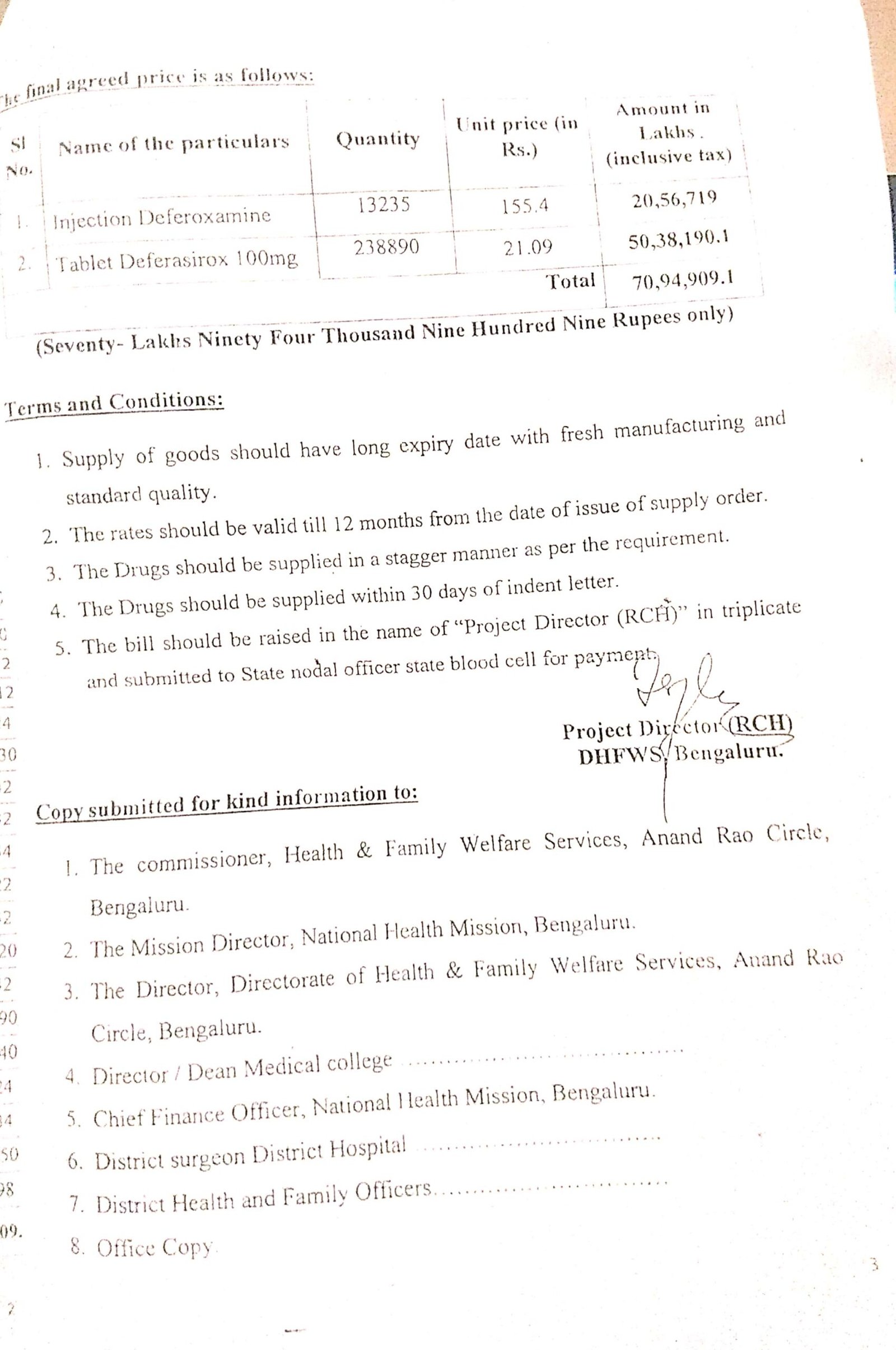 ಔಷಧ ಖರೀದಿಗೆ ಟೆಂಡರ್ ಪ್ರಕ್ರಿಯೆ ನಡೆಸಬೇಕಿದ್ದ ಅಧಿಕಾರಿಗಳು, ಮಾರುಕಟ್ಟೆಯಲ್ಲಿ ಈ ಔಷಧಗಳು ಲಭ್ಯವಿಲ್ಲ ಎಂದು ಸರ್ಕಾರವನ್ನು ದಾರಿತಪ್ಪಿಸಿದ್ದಾರಲ್ಲದೆ ಕರ್ನಾಟಕ ಪಾರದರ್ಶಕ ಕಾಯ್ದೆ ಅಧಿನಿಯಮದ 4(ಬಿ) ವಿನಾಯಿತಿಯನ್ನು ದುರ್ಬಳಕೆ ಮಾಡಿಕೊಂಡಿದ್ದಾರೆ. ಟೆಂಡರ್ ಪ್ರಕ್ರಿಯೆ ನಡೆಸದೆಯೇ ನಿರ್ದಿಷ್ಟ ಏಜೆನ್ಸಿಗೆ 70 ಲಕ್ಷ ರು. ಮೊತ್ತದ ಖರೀದಿ ಆದೇಶವನ್ನೂ ನೀಡಿದ್ದಾರೆ. ಇದಕ್ಕೆ ಸಂಬಂಧಿಸಿದಂತೆ ದಾಖಲೆಗಳು ‘ದಿ ಫೈಲ್’ಗೆ ಲಭ್ಯವಾಗಿದೆ.