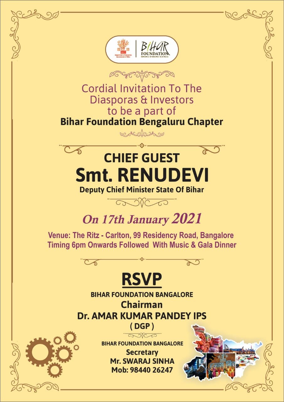 ಬೆಂಗಳೂರಿನಲ್ಲಿ ನಡೆಯಲಿರುವ ಹೂಡಿಕೆದಾರರ ಆಕರ್ಷಿಸುವ ಕಾರ್ಯಕ್ರಮಕ್ಕೆ ಬಿಹಾರದ ಉಪ ಮುಖ್ಯಮಂತ್ರಿ ರೇಣುದೇವಿ ಅವರು ಮುಖ್ಯ ಅತಿಥಿಯಾಗಿ ಭಾಗವಹಿಸಲಿದ್ದಾರೆ. ಕರ್ನಾಟಕ ಶ್ರೇಣಿಯ ಐಎಎಸ್‌, ಐಎಫ್‌ಎಸ್‌, ಐಪಿಎಸ್‌, ಐಆರ್‌ಎಸ್‌ನಲ್ಲಿ 20ಕ್ಕೂ ಹೆಚ್ಚು ಅಧಿಕಾರಿಗಳು ಬಿಹಾರ ಮೂಲದವರಾಗಿದ್ದಾರೆ. ಅಮರ್‌ಕುಮಾರ್‌ ಪಾಂಡೆ ಅವರೊಬ್ಬರನ್ನು ಹೊರತುಪಡಿಸಿದರೆ ಬಿಹಾರ ಮೂಲದ ಐಎಎಸ್‌, ಐಪಿಎಸ್‌, ಐಎಫ್‌ಎಸ್‌, ಐಆರ್‌ಎಸ್‌ ಸೇರಿದಂತೆ ಬೇರಾವ ಅಧಿಕಾರಿಗಳೂ ಹೂಡಿಕೆದಾರರ ಆಕರ್ಷಣೆಗಿಳಿದಿಲ್ಲ ಎಂದು ಗೊತ್ತಾಗಿದೆ.