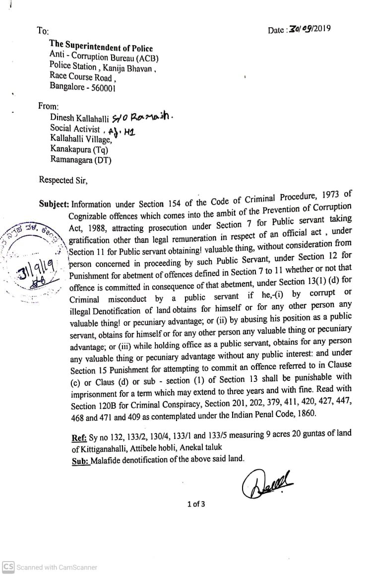 ಅತ್ತಿಬೆಲೆ ಹೋಬಳಿಯ ಕಿತ್ತಿಗಾನಹಳ್ಳಿ ಗ್ರಾಮದ ವಿವಿಧ ಸರ್ವೆ ನಂಬರ್ಗಳಲ್ಲಿ ಕೋಟ್ಯಂತರ ರು. ಬೆಲೆ ಬಾಳುವ ಒಟ್ಟು 9 ಎಕರೆ 20 ಗುಂಟೆ ಜಮೀನನ್ನು ಸಾರ್ವಜನಿಕ ಹಿತಾಸಕ್ತಿಗೆ ವಿರುದ್ಧವಾಗಿ ಭೂ ಸ್ವಾಧೀನದಿಂದ ಅಕ್ರಮವಾಗಿ ಕೈ ಬಿಡಲಾಗಿತ್ತು ಎಂದು ಸಾಮಾಜಿಕ ಕಾರ್ಯಕರ್ತ ದಿನೇಶ್ ಕಲ್ಲಹಳ್ಳಿ ಎಂಬುವರು 2019ರ ಸೆ. 30ರಂದು ದಾಖಲೆ ಸಮೇತ ದೂರು ಸಲ್ಲಿಸಿದ್ದರು. ಆದರೆ ಭ್ರಷ್ಟಾಚಾರ ನಿಗ್ರಹ ದಳದ ಪೊಲೀಸರು ಪ್ರಾಥಮಿಕ ಪರಿಶೀಲನೆ ಹಂತದಲ್ಲೇ ದೂರನ್ನು ಮುಕ್ತಾಯಗೊಳಿಸಿದ್ದಾರೆ.
