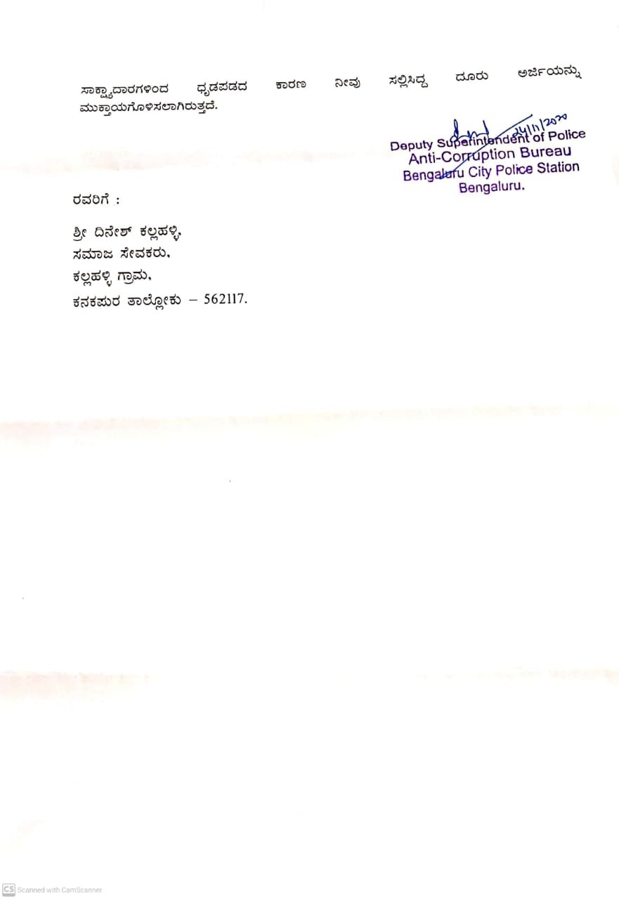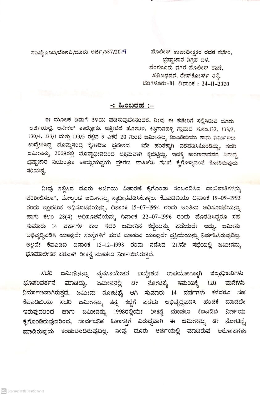ದೂರನ್ನು ಪರಿಶೀಲಿಸಿದ್ದ ಎಸಿಬಿ ಪೊಲೀಸರು ‘ಸಾರ್ವಜನಿಕ ಹಿತಾಸಕ್ತಿಗೆ ವಿರುದ್ಧವಾಗಿ ಈ ಜಮೀನನ್ನು ಡಿ ನೋಟಿಫೈ ಮಾಡಿರುವುದು ಕಂಡು ಬರುವುದಿಲ್ಲ. ದೂರರ್ಜಿಯಲ್ಲಿನ ಆರೋಪಗಳು ಸಾಕ್ಷ್ಯಾಧಾರಗಳಿಂದ ದೃಢಪಟ್ಟಿಲ್ಲ,’ ಎಂಬ ಕಾರಣವನ್ನು ಮುಂದೊಡ್ಡಿ ಅರ್ಜಿಯನ್ನು ಮುಕ್ತಾಯಗೊಳಿಸಿದ್ದಾರೆ. ಈ ಕುರಿತು ದೂರುದಾರ ದಿನೇಶ್ ಕಲ್ಲಹಳ್ಳಿ ಅವರಿಗೆ 2020ರ ನವೆಂಬರ್ 24ರಂದು ಹಿಂಬರಹವನ್ನು ನೀಡಿದ್ದಾರೆ. ಇದರ ಪ್ರತಿ ‘ದಿ ಫೈಲ್’ಗೆ ಲಭ್ಯವಾಗಿದೆ.