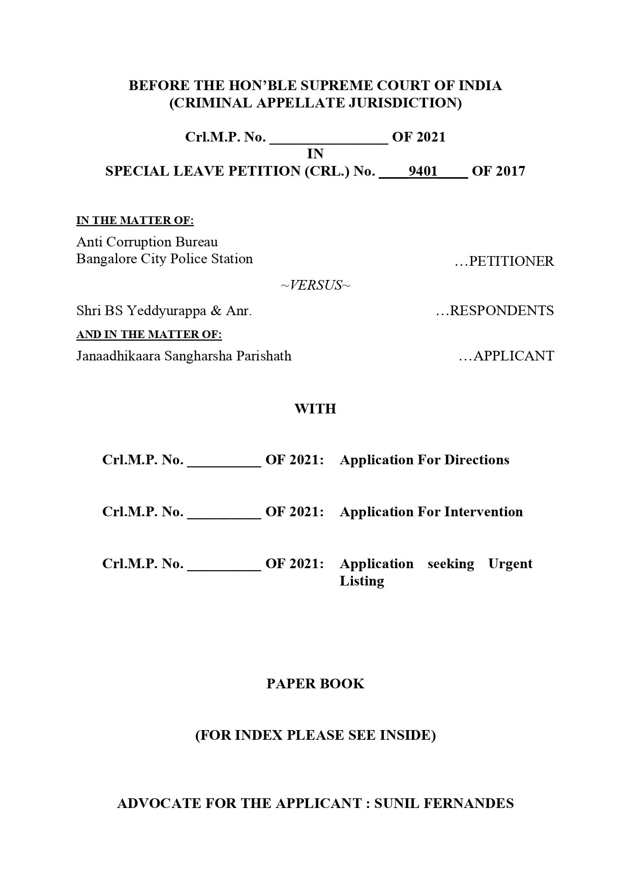 ತುರ್ತಾಗಿ ಅರ್ಜಿಯನ್ನು ಕೈಗೆತ್ತಿಕೊಳ್ಳಬೇಕು ಎಂದು ಕೋರಿರುವ ಜನಾಧಿಕಾರ ಸಂಘರ್ಷ ಪರಿಷತ್, ಪ್ರಕರಣದ ವಿಚಾರಣೆಯನ್ನು ಸುಪ್ರೀಂಕೋರ್ಟ್ನ ನಿಗಾದಲ್ಲಿರಬೇಕಲ್ಲದೆ ಇದು ಕರ್ನಾಟಕ ನ್ಯಾಯಾಲಯ ವ್ಯಾಪ್ತಿಯಿಂದ ಹೊರಗಿಟ್ಟು ಹೊರ ರಾಜ್ಯದ ನ್ಯಾಯಾಲಯಕ್ಕೆ ವರ್ಗಾಯಿಸಬೇಕು. ಹಾಗೆಯೇ ಪ್ರಕರಣದ ತನಿಖೆಯನ್ನು ಎಸಿಬಿ ಬದಲಿಗೆ ವಿಶೇಷ ತನಿಖಾ ತಂಡದ ಮೂಲಕ ನಡೆಸಬೇಕು ಎಂದು ಅರ್ಜಿಯಲ್ಲಿ ಮನವಿ ಮಾಡಿದೆ.