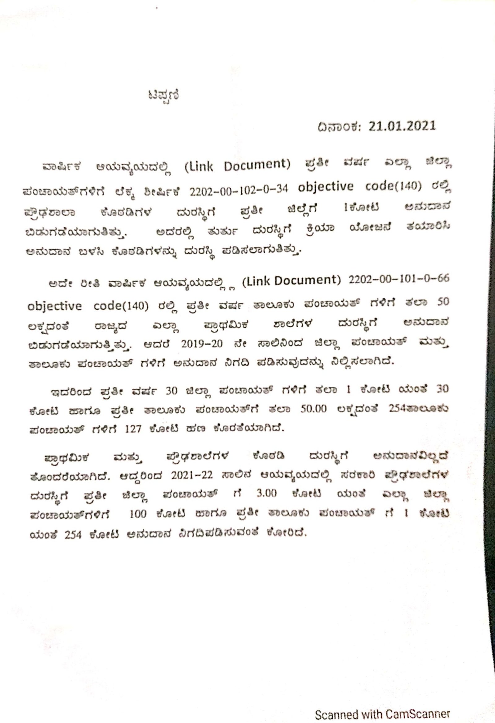 ಸರ್ಕಾರಿ ಪ್ರೌಢಶಾಲೆಗಳ ದುರಸ್ತಿಗೆ 2021-21ನೇ ಸಾಲಿನ ಆಯವ್ಯಯದಲ್ಲಿ ಅನುದಾನ ನಿಗದಿಪಡಿಸುವ ಸಂಬಂಧ ಗ್ರಾಮೀಣಾಭಿವೃದ್ಧಿ ಮತ್ತು ಪಂಚಾಯತ್ರಾಜ್ ಇಲಾಖೆ ಮುಖ್ಯಮಂತ್ರಿ ಯಡಿಯೂರಪ್ಪ ಅವರನ್ನು ಅಲವತ್ತುಕೊಂಡಿದೆ. 2021-22ನೇ ಸಾಲಿನ ಆಯವ್ಯಯದಲ್ಲಿ ಪ್ರತಿ ಜಿಲ್ಲಾ ಪಂಚಾಯತ್ಗೆ 3.00 ಕೋಟಿಯಂತೆ ಎಲ್ಲಾ ಜಿಲ್ಲಾ ಪಂಚಾಯತ್ಗಳಿಗೆ 100 ಕೋಟಿ ಹಾಗೂ ಪ್ರತಿ ತಾಲೂಕು ಪಂಚಾಯತ್ಗೆ 1 ಕೋಟಿಯಂತೆ ಒಟ್ಟು 254 ಕೋಟಿ ಅನುದಾನ ನಿಗದಿಪಡಿಸಬೇಕು ಎಂದು ಬೇಡಿಕೆ ಪಟ್ಟಿ ಸಲ್ಲಿಸಿದೆ ಎಂದು ಗೊತ್ತಾಗಿದೆ.