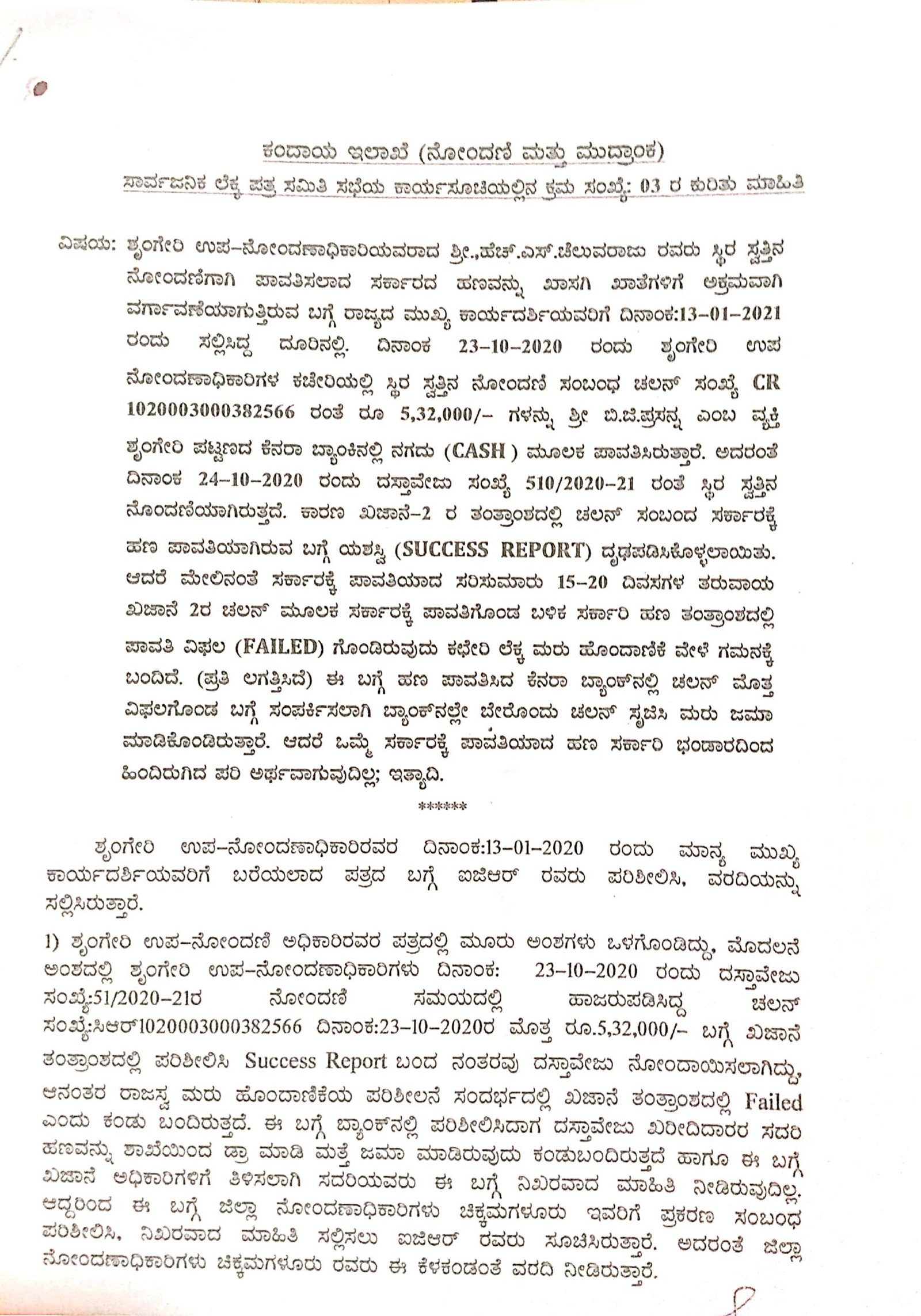 ಬಿ ಜಿ ಪ್ರಸನ್ನ ಎಂಬುವರ ಸ್ಥಿರ ಸ್ವತ್ತಿನ ನೋಂದಣಿಗೆ ಸಂಬಂಧಿಸಿದಂತೆ 1,32,000 ರು.ಭಾಗಶಃ ನಗದು ಮತ್ತು 4,00,000 ರು.ಗಳನ್ನು ಭಾಗಶಃ ಸೆಲ್ಫ್ ಚೆಕ್ ಮೂಲಕ ಒಟ್ಟು 5,32,000 ರು.ಗಳನ್ನು ಕೆನರಾ ಬ್ಯಾಂಕ್ನಲ್ಲಿ ಸಂದಾಯ ಮಾಡಿದ್ಧಾರೆ ಎಂದು ಹೇಳಿರುವ ಖಜಾನೆ ಇಲಾಖೆಯು, ಅದನ್ನು ಜಿ.ಎಲ್. ಖಾತೆಯಲ್ಲಿ ಜಮೆ ಮಾಡಿಕೊಳ್ಳಲಾಗಿದೆ ಎಂದು ನೀಡಿರುವ ವಿವರಣೆಯು ಅಪೂರ್ಣವಾಗಿದೆ ಎಂದು ತಿಳಿದು ಬಂದಿದೆ.
