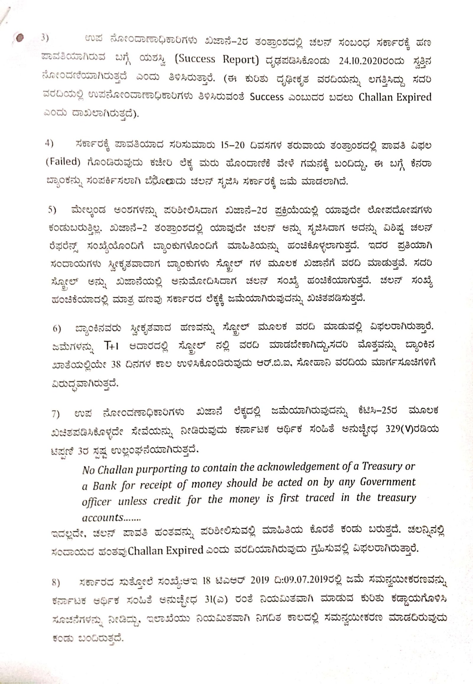ಬ್ಯಾಂಕ್ನವರು ಸರ್ಕಾರದ ಪರವಾಗಿ ಹಣವನ್ನು ಖಜಾನೆ 2ರಲ್ಲಿ ಸ್ವೀಕರಿಸಿದ ನಂತರ ನೇರವಾಗಿ ಅದನ್ನು ಖಜಾನೆಗೆ ಜಮಾ ಮಾಡಬೇಕು ಎಂಬ ಬಗ್ಗೆ ಸ್ಪಷ್ಟೀಕರಣ ನೀಡಿಲ್ಲದಿರುವುದು ವರದಿಯಿಂದ ಗೊತ್ತಾಗಿದೆ.
