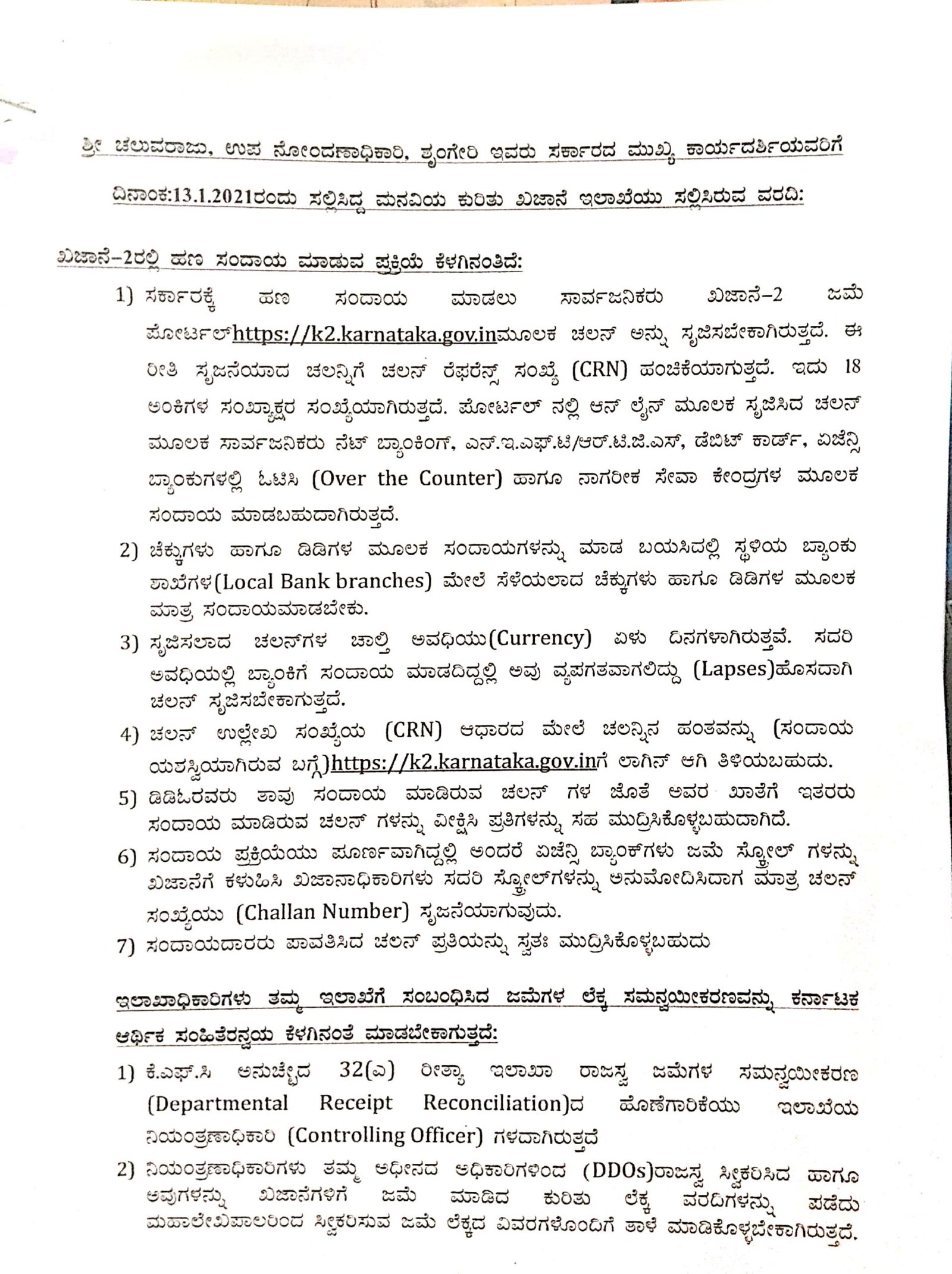 ಉಪ ನೋಂದಣಾಧಿಕಾರಿ ಚೆಲುವರಾಜು ಅವರು 2021ರ ಜನವರಿ 13ರಂದು ಸಲ್ಲಿಸಿದ್ದ ಮನವಿಗೆ ಸಂಬಂಧಿಸಿದಂತೆ ಖಜಾನೆ ಇಲಾಖೆಯು 4 ಪುಟಗಳ ವರದಿಯನ್ನು ಸಲ್ಲಿಸಿದೆ. ಖಜಾನೆ-2ರಲ್ಲಿ ಹಣ ಸಂದಾಯ ಮಾಡುವ ಪ್ರಕ್ರಿಯೆ, ಇಲಾಖಾಧಿಕಾರಿಗಳು ತಮ್ಮ ಇಲಾಖೆಗೆ ಸಂಬಂಧಿಸಿದ ಜಮೆಗಳ ಲೆಕ್ಕ ಸಮನ್ವಯೀಕರಣ, ಕೆಟಿಸಿ-25 ಜಮೆಗಳ ತ:ಖ್ತೆ, ಜಮೆ ವಹಿವಾಟುಗಳು ಕುರಿತು ವಿವರಣೆ ನೀಡುವ ಮೂಲಕ ಪ್ರಕರಣದಲ್ಲಿ ಯಾವುದೇ ಲೋಪಗಳು ನಡೆದಿಲ್ಲ ಎಂದು ತಿಪ್ಪೆ ಸಾರಿಸಲು ಯತ್ನಿಸಿರುವುದು ಮೇಲ್ನೋಟಕ್ಕೆ ಕಂಡು ಬಂದಿದೆ.
