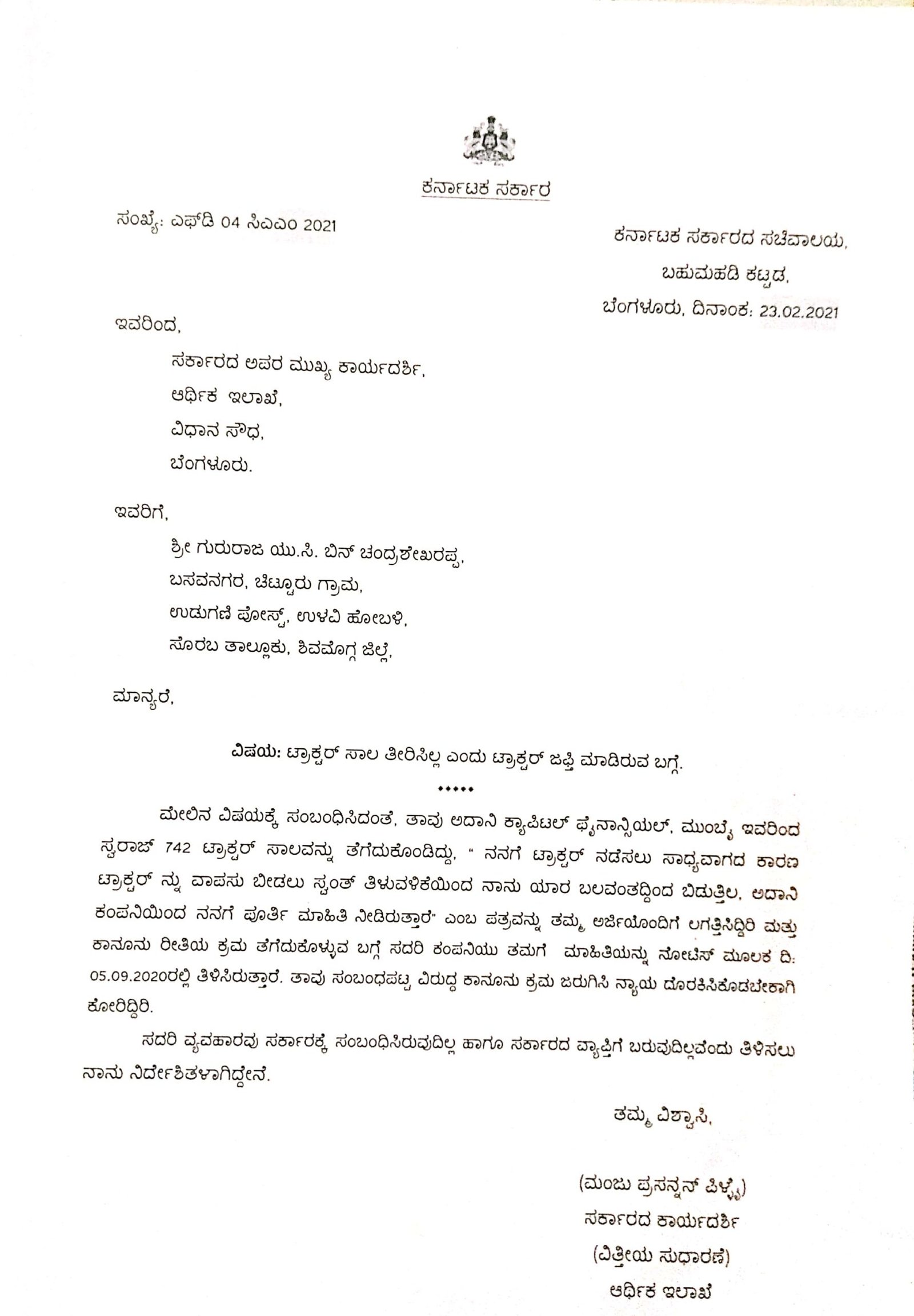 ಈ ಸಂಬಂಧ ರೈತ ಗುರುರಾಜ ಅವರು ಸರ್ಕಾರಕ್ಕೆ ಮನವಿ ಸಲ್ಲಿಸಿದ್ದರು. ಇವರ ನೆರವಿಗೆ ನಿಲ್ಲಬೇಕಿದ್ದ ಯಡಿಯೂರಪ್ಪ ನೇತೃತ್ವದ ಬಿಜೆಪಿ ಸರ್ಕಾರವು, ಬಾಧಿತ ರೈತನ ರಕ್ಷಣೆಗೆ ಧಾವಿಸಿಲ್ಲ. ‘ಈ ವ್ಯವಹಾರವು ಸರ್ಕಾರಕ್ಕೆ ಸಂಬಂಧಿಸಿಲ್ಲ ಮತ್ತು ಸರ್ಕಾರದ ವ್ಯಾಪ್ತಿಗೆ ಬರುವುದಿಲ್ಲ,’ ಎಂದು ಬಾಧಿತ ರೈತನಿಗೆ 2021ರ ಫೆ.23ರಂದು ಆರ್ಥಿಕ ಇಲಾಖೆಯ ವಿತ್ತೀಯ ಸುಧಾರಣೆ ವಿಭಾಗದ ಸರ್ಕಾರದ ಕಾರ್ಯದರ್ಶಿ ಮಂಜು ಪ್ರಸನ್ನನ್ ಪಿಳ್ಳೈ ಅವರು ಹಿಂಬರಹ ನೀಡಿದ್ದಾರೆ. ಇದರ ಪ್ರತಿ ‘ದಿ ಫೈಲ್’ಗೆ ಲಭ್ಯವಾಗಿದೆ.