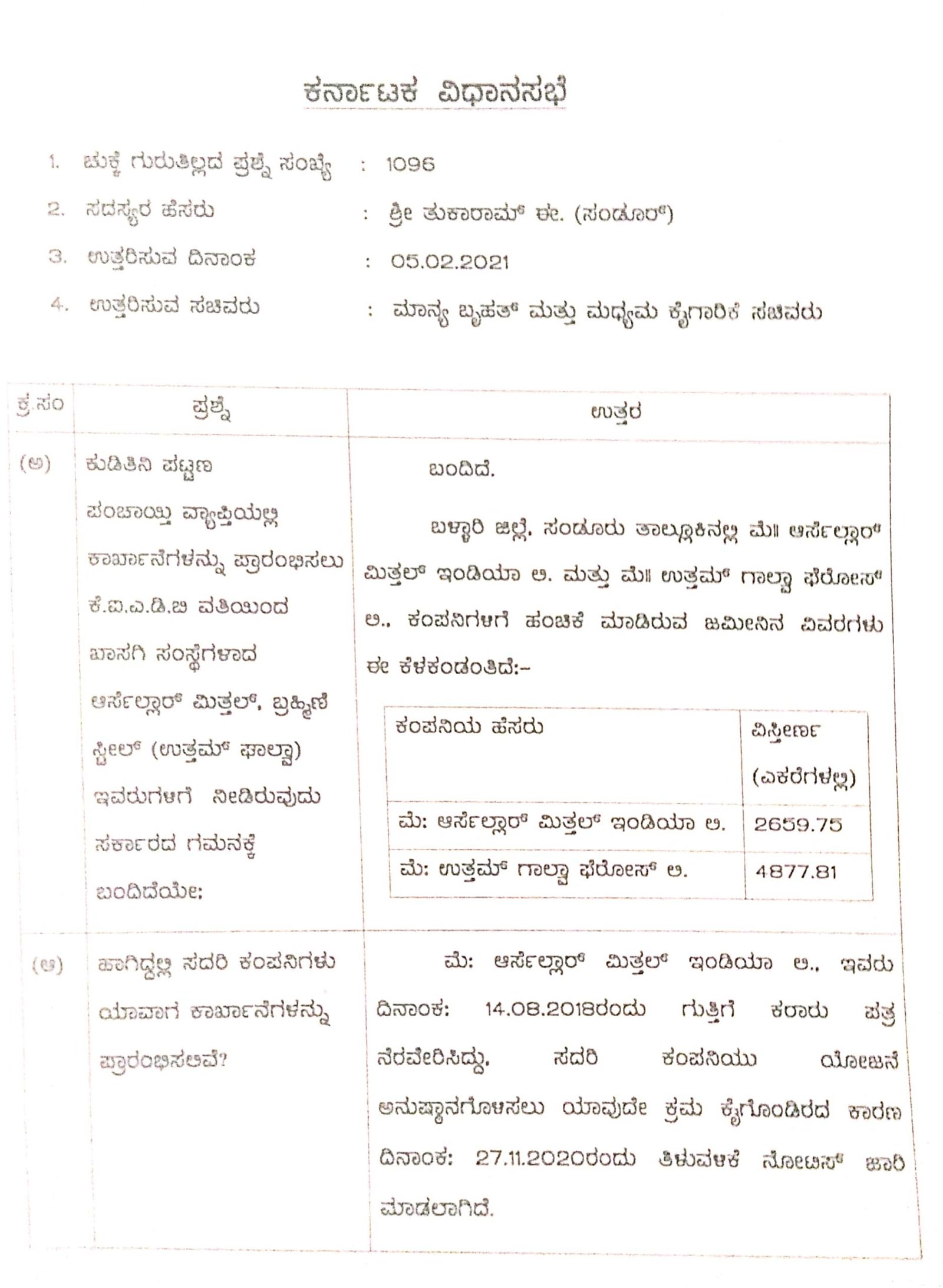 ಬಳ್ಳಾರಿಯ ಸಂಡೂರು ತಾಲೂಕಿನ ಕುಡಿತಿನಿ ಪಟ್ಟಣ ಪಂಚಾಯ್ತಿ ವ್ಯಾಪ್ತಿಯಲ್ಲಿ ಆರ್ಸೆಲರ್ ಮಿತ್ತಲ್ ಇಂಡಿಯಾ ಲಿಮಿಟೆಡ್ಗೆ 2,659.75 ಎಕರೆ, ಉತ್ತಮ್ ಗಾಲ್ವಾ ಫೆರೋಸ್ ಲಿಮಿಟೆಡ್ಗೆ 4,877.81 ಎಕರೆ ಜಮೀನನ್ನು ಕೈಗಾರಿಕೆ ನಿರ್ಮಾಣ ಉದ್ಧೇಶಕ್ಕೆ ಜಮೀನು ಹಂಚಿಕೆ ಮಾಡಿತ್ತು. ಹಂಚಿಕೆಯಾಗಿ 8 ವರ್ಷದ ಬಳಿಕ ಆರ್ಸೆಲರ್ ಮಿತ್ತಲ್ ಕಂಪನಿಯು 2018ರಲ್ಲಿ ಗುತ್ತಿಗೆ ಕರಾರು ಪತ್ರ ಮಾಡಿಕೊಂಡಿದ್ದರೆ, ಉತ್ತಮ್ ಗಾಲ್ವಾ ಫೆರೋಸ್ ಲಿಮಿಟೆಡ್ 2017ರಲ್ಲಿ ಗುತ್ತಿಗೆ ಕರಾರು ಪ್ರಕ್ರಿಯೆ ಪೂರ್ಣಗೊಳಿಸಿದೆ. ಈ ಪ್ರಕ್ರಿಯೆ ನಡೆದು 2 ವರ್ಷಗಳಾದರೂ ಯೋಜನೆಯನ್ನು ಅನುಷ್ಠಾನಗೊಳಿಸಲು ಯಾವುದೇ ಕ್ರಮ ಕೈಗೊಂಡಿಲ್ಲ.