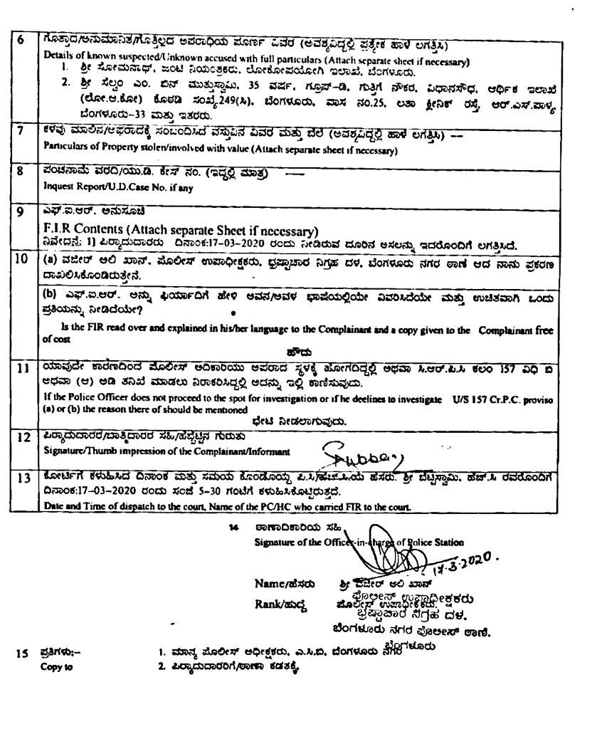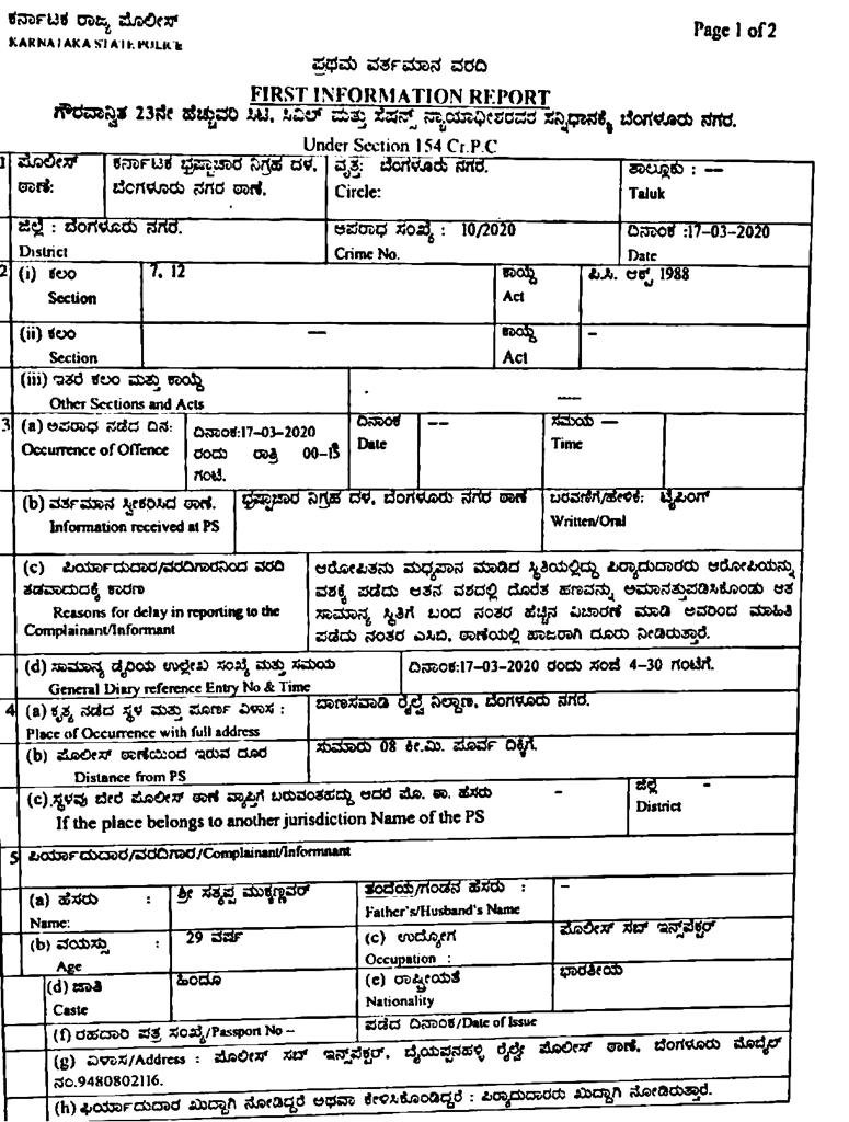 ವಿಕಾಸಸೌಧದಲ್ಲಿರುವ ಲೋಕೋಪಯೋಗಿ ಇಲಾಖೆಯಲ್ಲಿ ಜಂಟಿ ನಿಯಂತ್ರಕರಾಗಿ ಕಾರ್ಯನಿರ್ವಹಿಸುತ್ತಿರುವ ಸೋಮನಾಥ್ ಮತ್ತು ವಿಧಾನಸೌಧದಲ್ಲಿರುವ ಆರ್ಥಿಕ ಇಲಾಖೆಯ ಡಿ ಗ್ರೂಪ್ ನೌಕರ ಎಂ ಸೆಲ್ವಂ ಎಂಬುವರ ವಿರುದ್ಧ ಭ್ರಷ್ಟಾಚಾರ ನಿಗ್ರಹ ದಳವು 2020ರ ಮಾರ್ಚ್ 17ರಂದು ಎಫ್ಐಆರ್ ದಾಖಲಿಸಿತ್ತು.