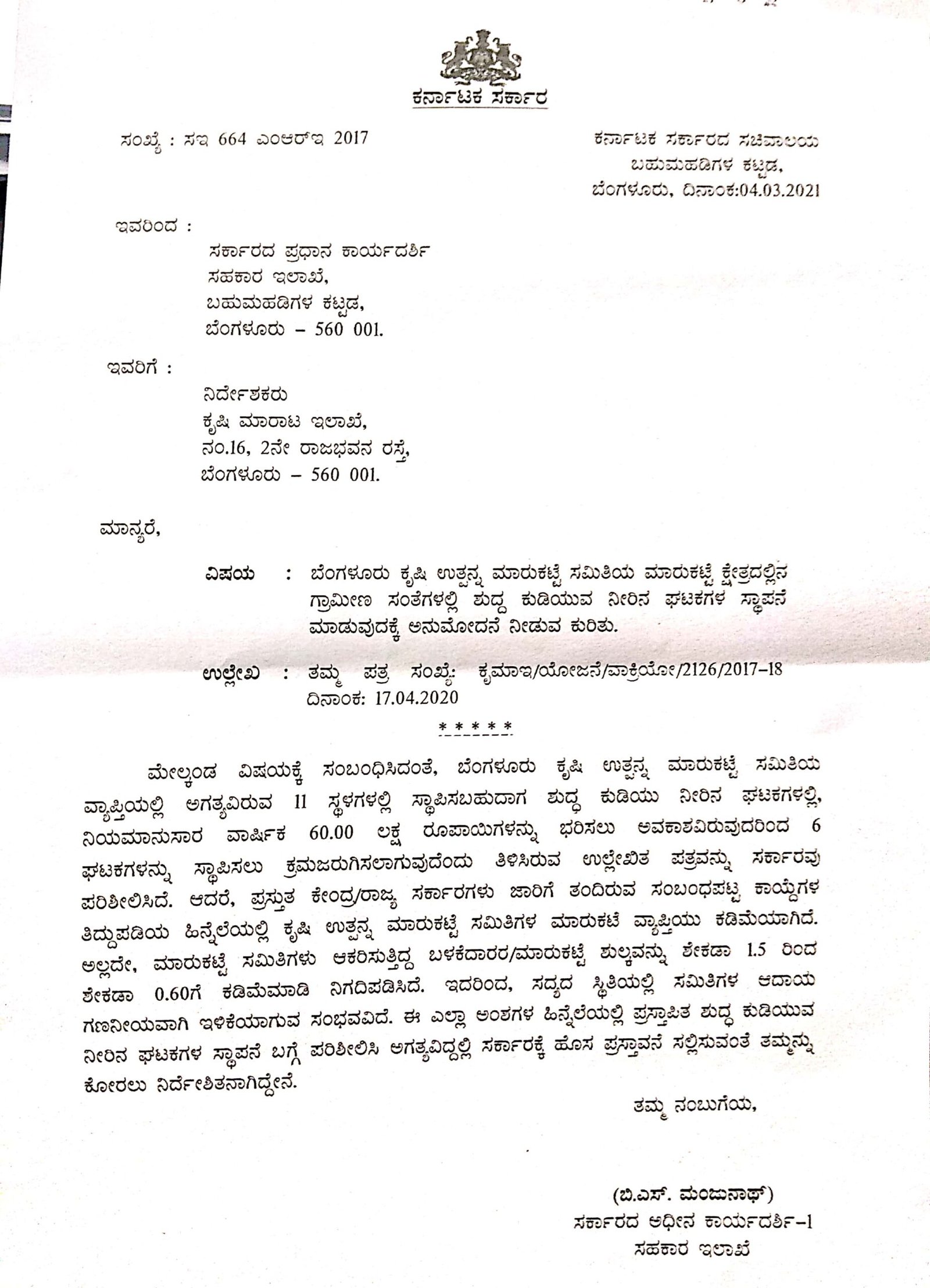 ಬೆಂಗಳೂರು ಕೃಷಿ ಉತ್ಪನ್ನ ಮಾರುಕಟ್ಟೆ ಸಮಿತಿ ವ್ಯಾಪ್ತಿಯಲ್ಲಿ 11 ಸ್ಥಳಗಳಲ್ಲಿ ಶುದ್ಧ ಕುಡಿಯುವ ನೀರು ಘಟಕಗಳನ್ನು ಸ್ಥಾಪಿಸಲು ಕೃಷಿ ಮಾರಾಟ ಇಲಾಖೆ ಪ್ರಸ್ತಾವನೆ ಸಲ್ಲಿಸಿತ್ತು. ಈ ಘಟಕಗಳಿಗೆ ನಿಯಮಾನುಸಾರ ವಾರ್ಷಿಕ 60.00 ಲಕ್ಷ ರು. ಭರಿಸಲು ಅವಕಾಶವಿದೆ. ಆದರೆ ಎಪಿಎಂಸಿ ಕಾಯ್ದೆಗೆ ತಂದಿರುವ ತಿದ್ದುಪಡಿಯು ಘಟಕಗಳ ಸ್ಥಾಪನೆಗೂ ಅಡ್ಡಿಯಾಗಿರುವುದು ಸಹಕಾರ ಇಲಾಖೆ ಬರೆದಿರುವ ಪತ್ರದಿಂದ ತಿಳಿದು ಬಂದಿದೆ.