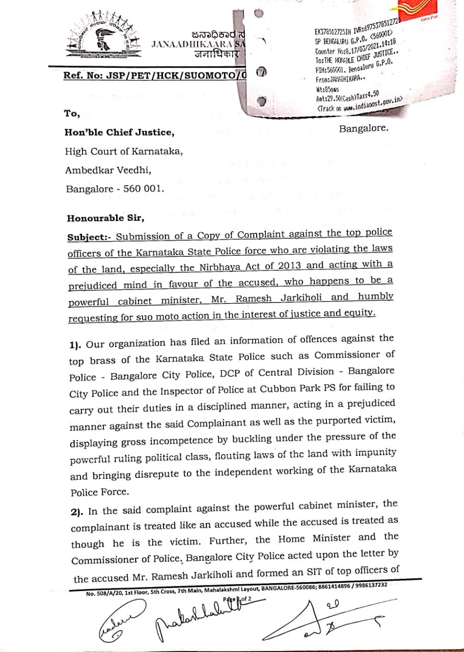 ಈ ಪ್ರಕರಣದಲ್ಲಿ ಕ್ಯಾಬಿನೆಟ್ ದರ್ಜೆಯ ಸಚಿವರ ವಿರುದ್ಧ ದೂರು ಸಲ್ಲಿಸಿದ್ದ ದೂರುದಾರರನ್ನು ಅಪರಾಧಿಯಂತೆ ಪರಿಗಣಿಸಿ ಮತ್ತು ನಿಜವಾದ ಅಪರಾಧಿಯನ್ನೇ ಸಂತ್ರಸ್ತನೆಂದು ಪರಿಗಣಿಸಲಾಗುತ್ತಿದೆ. ಅಲ್ಲದೆ ಅಪರಾಧಿಯ ಪತ್ರದ ಮೇರೆಗೆ ಗೃಹ ಸಚಿವರು ಹಾಗೂ ಬೆಂಗಳೂರು ನಗರದ ಪೊಲೀಸ್ ಆಯುಕ್ತರು ಉನ್ನತ ಅಧಿಕಾರಿಗಳನ್ನೊಳಗೊಂಡ ವಿಶೇಷ ತನಿಖಾ ತಂಡವನ್ನೇ ರಚಿಸಿರುವುದು ರಾಜಕೀಯ ಮತ್ತು ಅಧಿಕಾರ ದುರುಪಯೋಗಕ್ಕೆ ಸಾಕ್ಷಿಯಾಗಿದೆ. ಹಾಗೆಯೇ ತೆರಿಗೆದಾರರ ಹಣವನ್ನು ಪೋಲು ಮಾಡಲಾಗುತ್ತಿದೆ. ಈ ಅಂಶಗಳನ್ನಳಗೊಂಡಂತೆ ದೂರನ್ನು ಮುಖ್ಯ ನ್ಯಾಯಾಧೀಶರು ಪುರಸ್ಕರಿಸಿ ಸ್ವಯಂ ಪ್ರೇರಿತ ಪ್ರಕರಣವನ್ನು ದಾಖಲಿಸಿಕೊಳ್ಳಬೇಕು ಎಂದು ಕೋರಿದೆ.