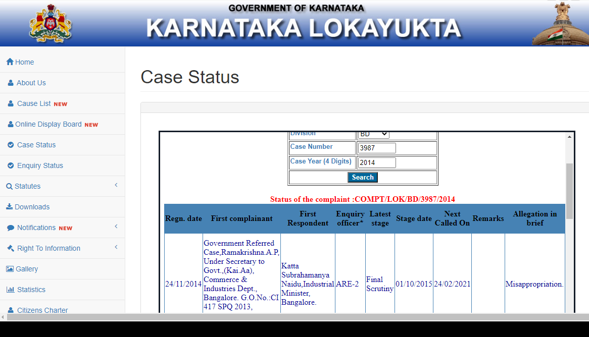 ಪ್ರಕರಣದ ತನಿಖೆಗಾಗಿ ಸರ್ಕಾರವು ಎಲ್ಲಾ ದಾಖಲಾತಿ ಮತ್ತು ಕಡತಗಳನ್ನು ಲೋಕಾಯುಕ್ತಕ್ಕೆ ಸಲ್ಲಿಸಿತ್ತು. 2017ರವರೆಗೂ ದಾಖಲಾತಿಗಳನ್ನು ಸಂಗ್ರಹಿಸುವುದರಲ್ಲೇ ಕಾಲಹರಣ ಮಾಡಿರುವ ಲೋಕಾಯುಕ್ತ ಸಂಸ್ಥೆಯು ಅಂತಿಮ ವರದಿ ತಯಾರಿಸಲು ಬಾಕಿ ಇರಿಸಿಕೊಂಡಿದೆ ಎಂದು ಸಂಸ್ಥೆಯ ರಿಜಿಸ್ಟ್ರಾರ್‌ ಎಚ್‌ ಎಂ ನಂಜುಂಡಸ್ವಾಮಿ ಅವರು ಸರ್ಕಾರಕ್ಕೆ 2017ರ ಮಾರ್ಚ್‌ 9ರಂದು ಮಾಹಿತಿ ಒದಗಿಸಿದ್ದರು. ಇದಾದ ನಂತರ ಸುಮಾರು 2 ವರ್ಷಗಳು ಕಳೆದರೂ ಪ್ರಕರಣಕ್ಕೆ ಸಂಬಂಧಿಸಿದಂತೆ ವಿಚಾರಣೆಯು ಯಾವ ಹಂತದಲ್ಲಿದೆ ಎಂಬ ಬಗ್ಗೆ ಸರ್ಕಾರಕ್ಕೆ ಮಾಹಿತಿಯನ್ನೇ ಒದಗಿಸಿರಲಿಲ್ಲ ಎಂಬುದು ಗೊತ್ತಾಗಿದೆ.
