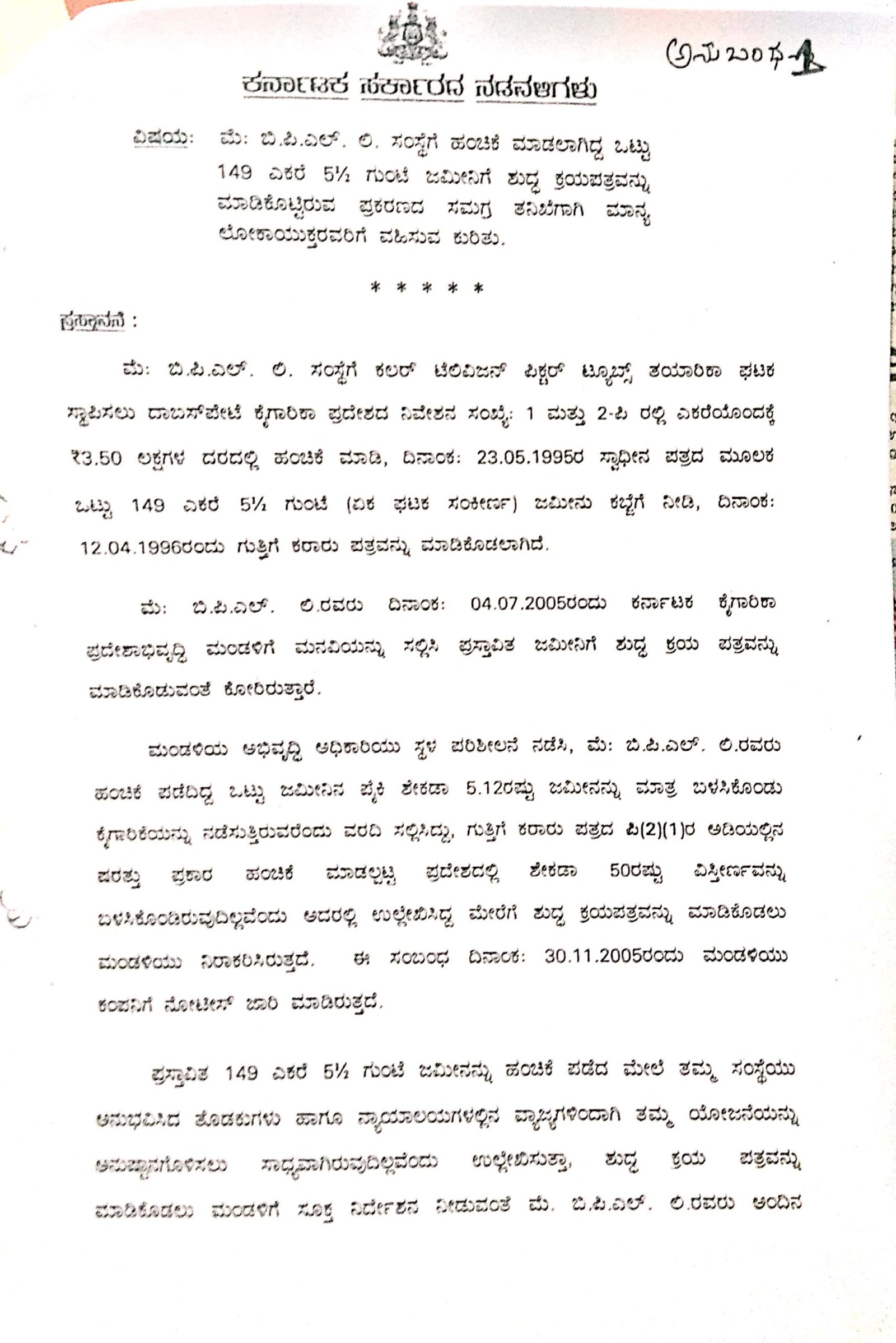 ದಾಬಸ್‌ಪೇಟೆ ಕೈಗಾರಿಕಾ ಪ್ರದೇಶದಲ್ಲಿ ಎಕರೆಗೆ 3.50 ಲಕ್ಷ ರು.ದರದಲ್ಲಿ 1995ರ ಮೇ 23ರಂದು 149 ಎಕರೆ 5.50 ಗುಂಟೆ ಜಮೀನು ಹಂಚಿಕೆ ಮಾಡಲಾಗಿತ್ತು. 1996ರಲ್ಲಿ ಗುತ್ತಿಗೆ ಕ್ರಯ ಪತ್ರ ಮಾಡಿಕೊಟ್ಟಿದ್ದರೂ ಒಟ್ಟು ಜಮೀನಿನ ಪೈಕಿ ಶೇ.5.12ರಷ್ಟು ಮಾತ್ರ ಬಳಸಿಕೊಂಡಿತ್ತು. ಗುತ್ತಿಗೆ ಕರಾರು ಪತ್ರದ ಪಿ(2)(1)ರ ಅಡಿಯಲ್ಲಿ ಷರತ್ತಿನ ಪ್ರಕಾರ ಹಂಚಿಕೆ ಮಾಡಲ್ಪಟ್ಟ ಪ್ರದೇಶದಲ್ಲಿ ಶೇ.50ರಷ್ಟು ವಿಸ್ತೀರ್ಣವನ್ನು ಬಳಸಿಕೊಂಡಿರಲಿಲ್ಲ. ಹೀಗಾಗಿ ಕರ್ನಾಟಕ ಕೈಗಾರಿಕೆ ಪ್ರದೇಶಾಭಿವೃದ್ಧಿ ಮಂಡಳಿಯು ಶುದ್ಧ ಕ್ರಯ ಪತ್ರವನ್ನು ಮಾಡಿಕೊಟ್ಟಿರಲಿಲ್ಲ.