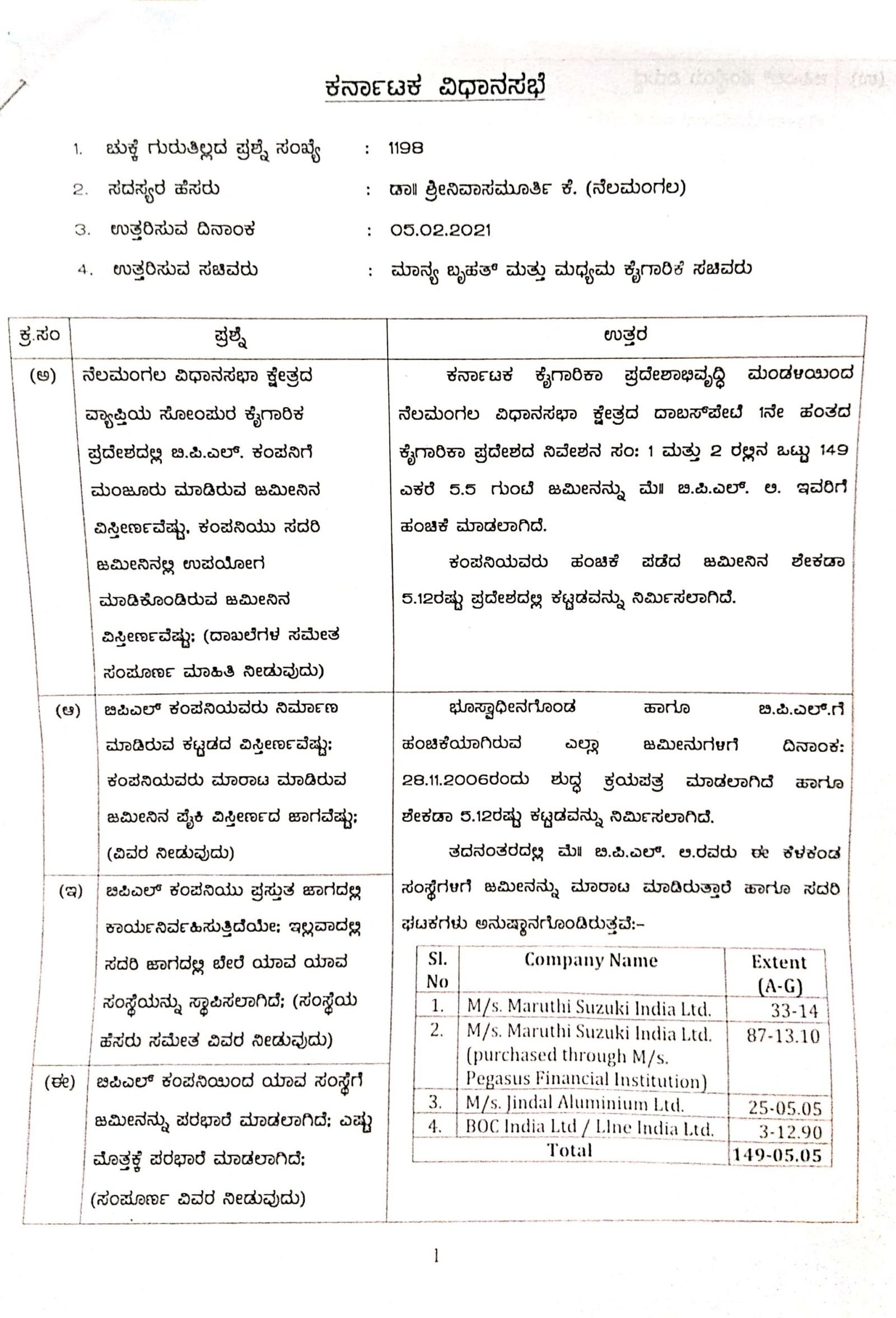 ಪ್ರಕರಣದ ಕುರಿತು 2021ರ ಫೆಬ್ರುವರಿಯಲ್ಲಿ ನಡೆದಿದ್ದ ಅಧಿವೇಶನದಲ್ಲಿ ಶಾಸಕ ಡಾ ಕೆ ಶ್ರೀನಿವಾಸಮೂರ್ತಿ ಅವರು ಚುಕ್ಕೆ ಗುರುತಿಲ್ಲದ ಪ್ರಶ್ನೆಯನ್ನು ಕೇಳಿದ್ದರು. ಈ ಸಂಬಂಧ ಬೃಹತ್‌ ಮತ್ತು ಮಧ್ಯಮ ಕೈಗಾರಿಕೆ ಸಚಿವ ಜಗದೀಶ್‌ ಶೆಟ್ಟರ್‌ ಅವರು 2021ರ ಫೆ. 5ರಂದು ವಿಧಾನಸಭೆಗೆ ಲಿಖಿತ ಉತ್ತರಿಸಿದ್ದಾರೆ.