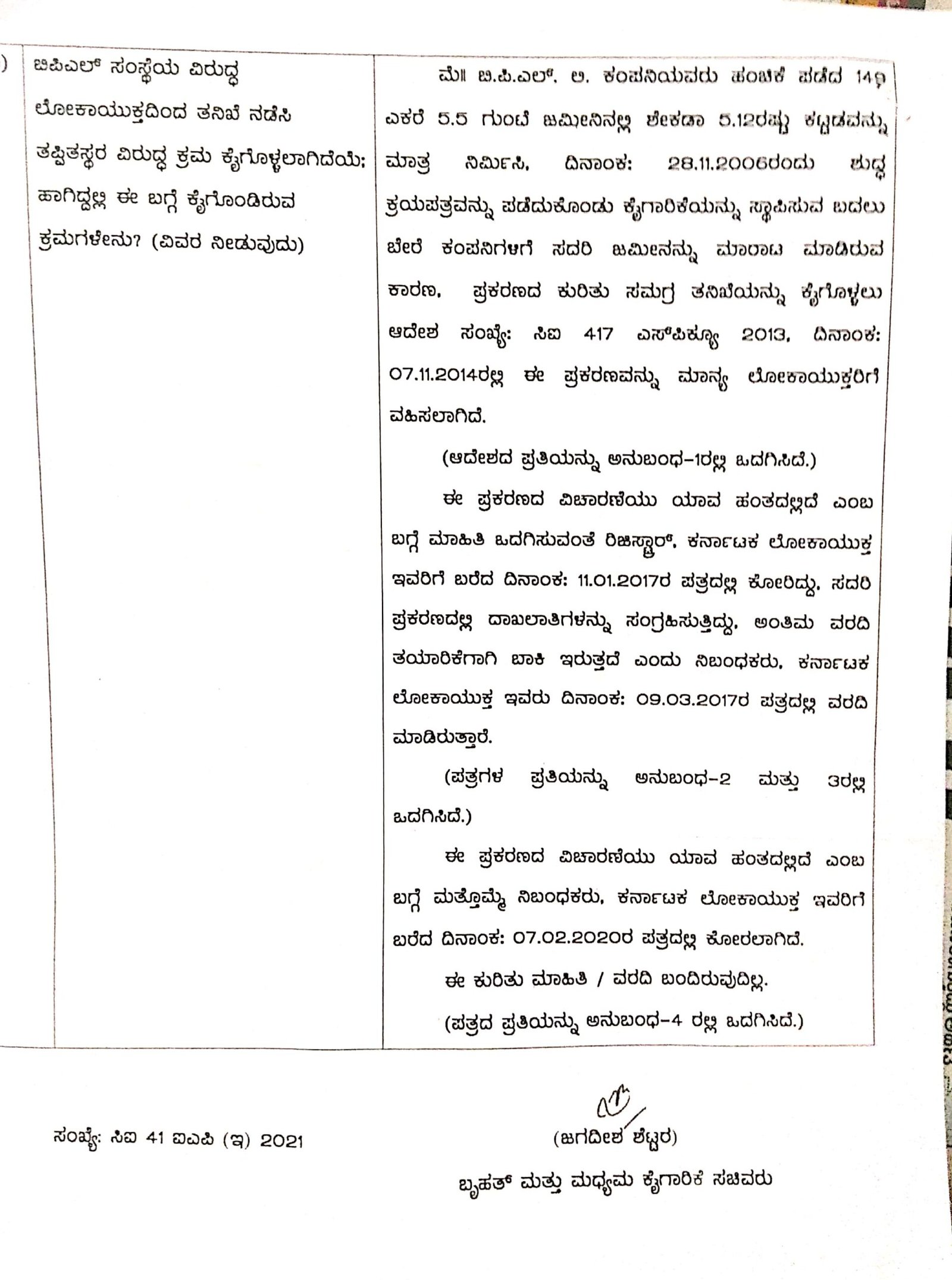 ‘ಈ ಪ್ರಕರಣದ ವಿಚಾರಣೆಯು ಯಾವ ಹಂತದಲ್ಲಿದೆ ಎಂಬ ಬಗ್ಗೆ ಮಾಹಿತಿ ಕೋರಿ ವಾಣಿಜ್ಯ ಮತ್ತು ಕೈಗಾರಿಕೆ ಇಲಾಖೆಯು 2020ರ ಫೆ.7ರಂದು ಬರೆದಿದ್ದ ಪತ್ರಕ್ಕೆ ವರ್ಷ ಕಳೆದರೂ ಮಾಹಿತಿ ಮತ್ತು ವರದಿಯನ್ನೂ ಲೋಕಾಯುಕ್ತ ಸಂಸ್ಥೆ ಸರ್ಕಾರಕ್ಕೆ ಸಲ್ಲಿಸಿಲ್ಲ,’ ಎಂಬ ಸಂಗತಿ ಶೆಟ್ಟರ್‌ ಅವರು ನೀಡಿರುವ ಉತ್ತರದಿಂದ ತಿಳಿದು ಬಂದಿದೆ.