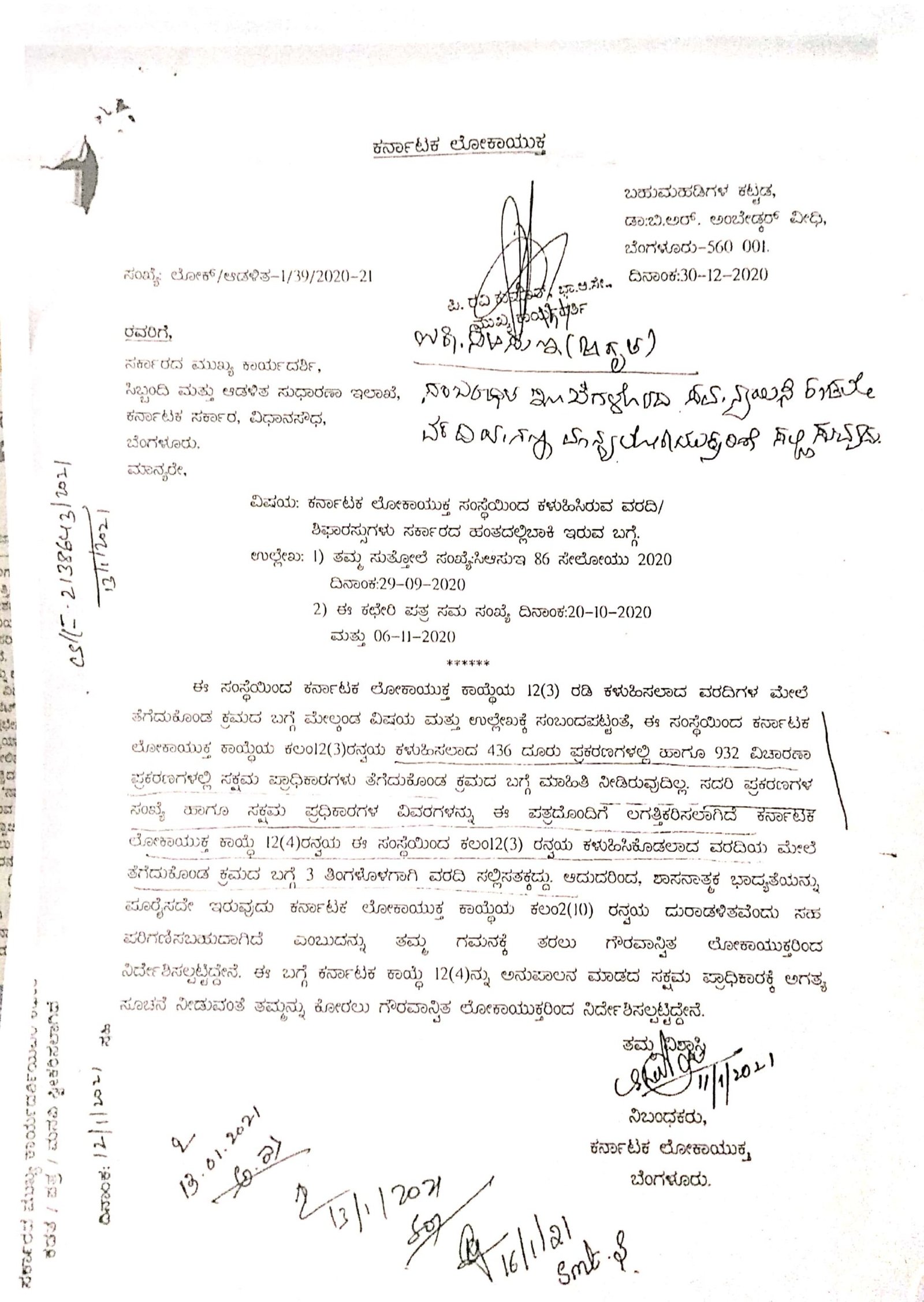 ಈ ಪತ್ರವನ್ನಾಧರಿಸಿ ರಾಜ್ಯ ಸರ್ಕಾರದ ಮುಖ್ಯ ಕಾರ್ಯದರ್ಶಿ ಪಿ ರವಿಕುಮಾರ್ ಅವರು ಸಂಬಂಧಿತ ಇಲಾಖೆಗಳೊಂದಿಗೆ ಸಮನ್ವಯ ಸಾಧಿಸಿ ಕೂಡಲೇ ವರದಿಯನ್ನು ಲೋಕಾಯುಕ್ತರಿಗೆ ಸಲ್ಲಿಸಬೇಕು ಎಂದು ಸಿಬ್ಬಂದಿ ಆಡಳಿತ ಸುಧಾರಣೆ ಇಲಾಖೆಯ ಸರ್ಕಾರದ ಕಾರ್ಯದರ್ಶಿಗೆ ಸೂಚಿಸಿರುವುದು ಪತ್ರದಿಂದ ತಿಳಿದು ಬಂದಿದೆ.