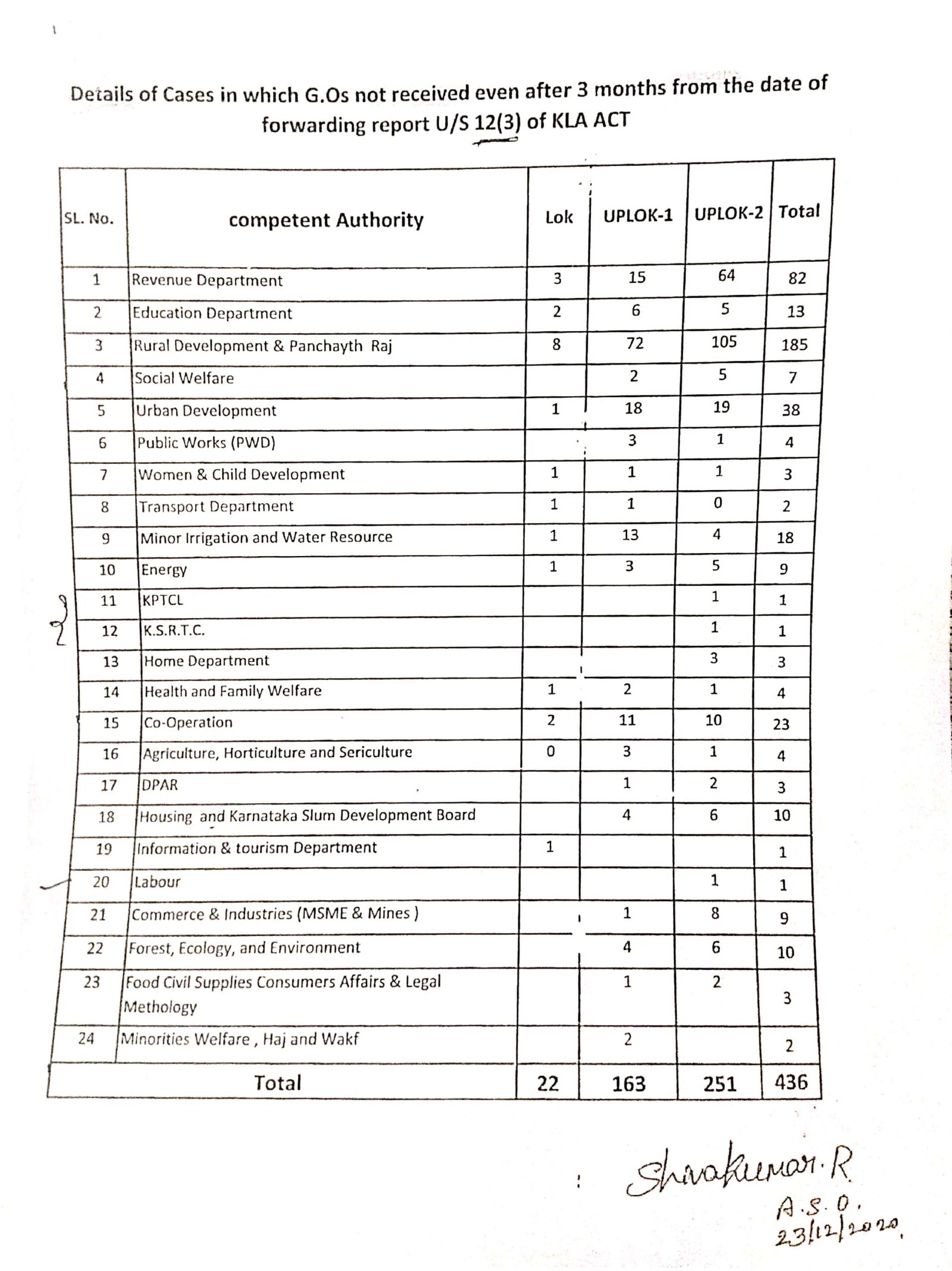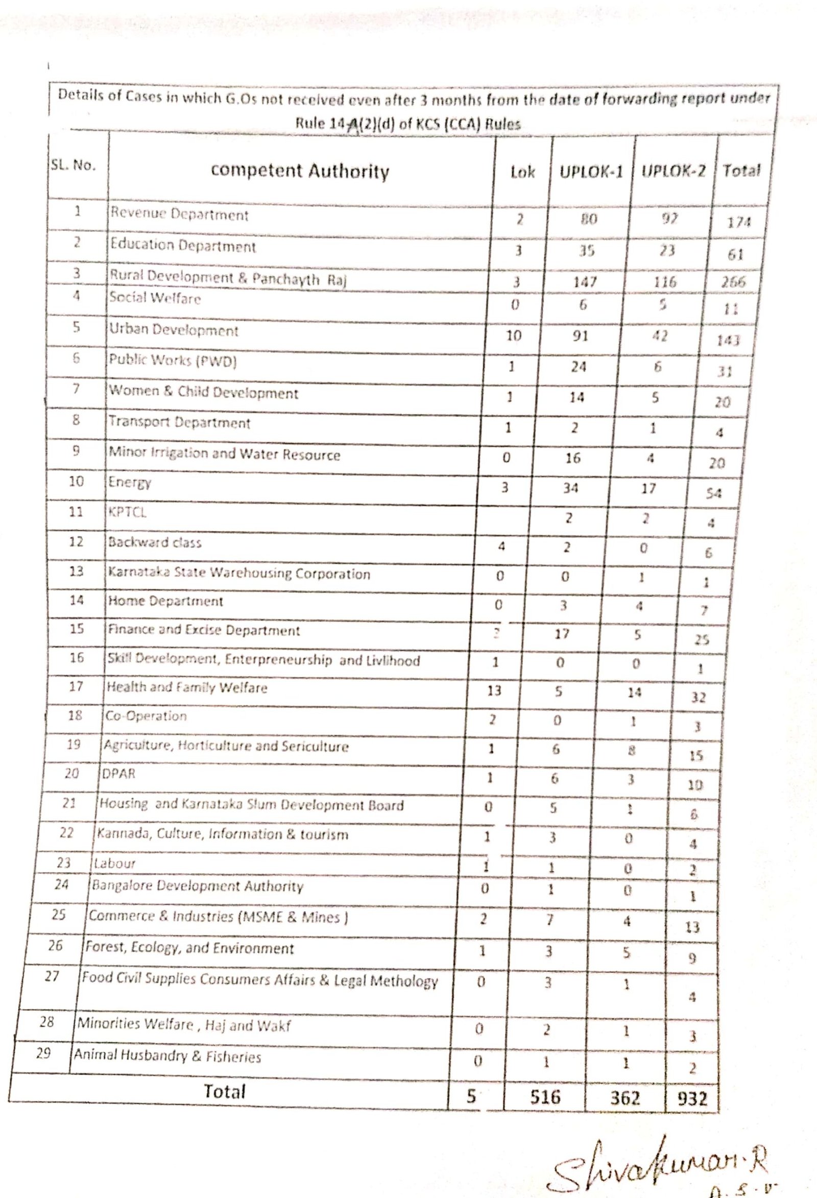 ಲೋಕಾಯುಕ್ತ ಕಾಯ್ದೆ 12(3) ಅನ್ವಯ ಕಂದಾಯ ಇಲಾಖೆ ಸೇರಿದಂತೆ ಒಟ್ಟು 24 ಇಲಾಖೆಗಳಿಗೆ ಸಂಬಂಧಿಸಿದ ಅಧಿಕಾರಿ, ನೌಕರರ ವಿರುದ್ಧ 436 ಪ್ರಕರಣಗಳ ವರದಿಗಳನ್ನು ಸರ್ಕಾರಕ್ಕೆ ಕಳಿಸಿತ್ತು. ಇದರಲ್ಲಿ ಲೋಕಾಯುಕ್ತರ ಅಧಿಕಾರ ವ್ಯಾಪ್ತಿಯಲ್ಲಿ 22, ಉಪ ಲೋಕಾಯುಕ್ತ-1 ಕಾರ್ಯವ್ಯಾಪ್ತಿಯಲ್ಲಿ 163, ಉಪ ಲೋಕಾಯುಕ್ತ -2 ಕಾರ್ಯವ್ಯಾಪ್ತಿಯಲ್ಲಿ 251 ಪ್ರಕರಣಗಳಿವೆ. ಈ ಪೈಕಿ ಗ್ರಾಮೀಣಾಭಿವೃದ್ಧಿ ಮತ್ತು ಪಂಚಾಯತ್ರಾಜ್ ಇಲಾಖೆ ಅಗ್ರ ಸ್ಥಾನದಲ್ಲಿರುವುದು ಪತ್ರದಿಂದ ಗೊತ್ತಾಗಿದೆ.