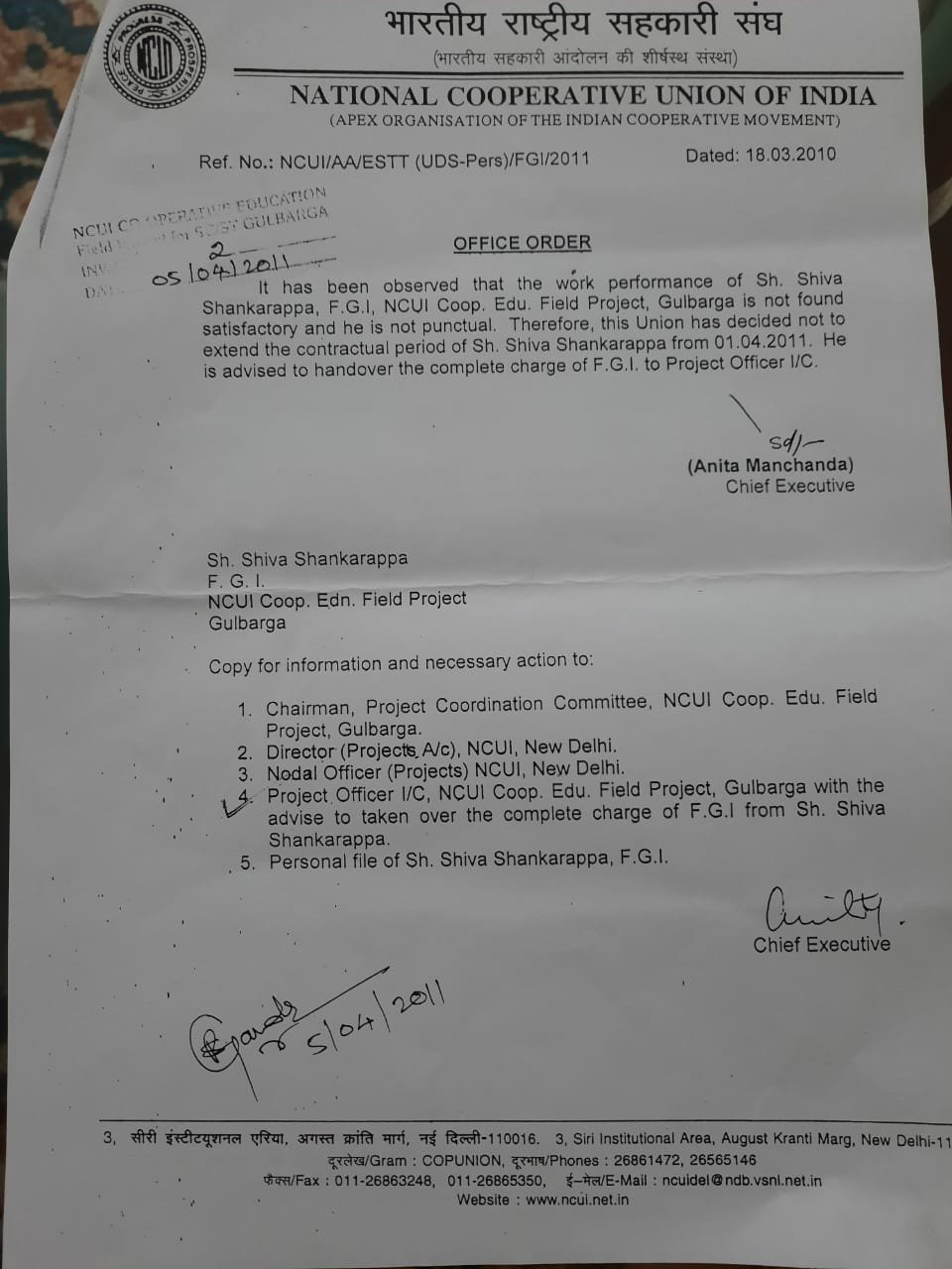 ಎನ್ಸಿಯುಐನಲ್ಲಿ(ನ್ಯಾಷನಲ್ ಕೋ ಆಪರೇಟೀವ್ ಯೂನಿಯನ್ ಆಫ್ ಇಂಡಿಯಾ)ದ ಗುಲ್ಬರ್ಗಾ ಶಾಖೆಯ ಕಾರ್ಯಕ್ಷೇತ್ರದಲ್ಲಿ ಶಿವಶಂಕರಪ್ಪ ಎಸ್ ಸಾಹುಕಾರ್ ಅವರು ಎಫ್ಜಿಐ ಆಗಿ ಗುತ್ತಿಗೆ ಅವಧಿಯಲ್ಲಿ ಕಾರ್ಯನಿರ್ವಹಿಸುತ್ತಿದ್ದರು. ಆ ಅವಧಿಯಲ್ಲಿ ಅವರ ಕಾರ್ಯನಿರ್ವಹಣೆ ತೃಪ್ತಿಕರವಾಗಿರಲಿಲ್ಲ ಮತ್ತು ಸಮಯ ಪ್ರಜ್ಞೆ ಹೊಂದಿರಲಿಲ್ಲ. ಹೀಗಾಗಿ ಅವರ ಗುತ್ತಿಗೆ ಅವಧಿಯನ್ನು ವಿಸ್ತರಿಸಬಾರದು ಯೂನಿಯನ್ನ ಮುಖ್ಯ ಕಾರ್ಯನಿರ್ವಾಹಕ ಅನಿತಾ ಮಂಚಾಡ ಅವರು 2010ರ ಮಾರ್ಚ್ 18ರಂದು ಆದೇಶ ಹೊರಡಿಸಿದ್ದರು. ಮತ್ತು ಯಾವುದೇ ಪ್ರಭಾರ ಕಾರ್ಯಭಾರವನ್ನೂ ವಹಿಸಬಾರದು ಎಂದು ಸಲಹೆ ನೀಡಿದ್ದರು ಎಂಬುದು ಆದೇಶದಿಂದ ತಿಳಿದು ಬಂದಿದೆ.