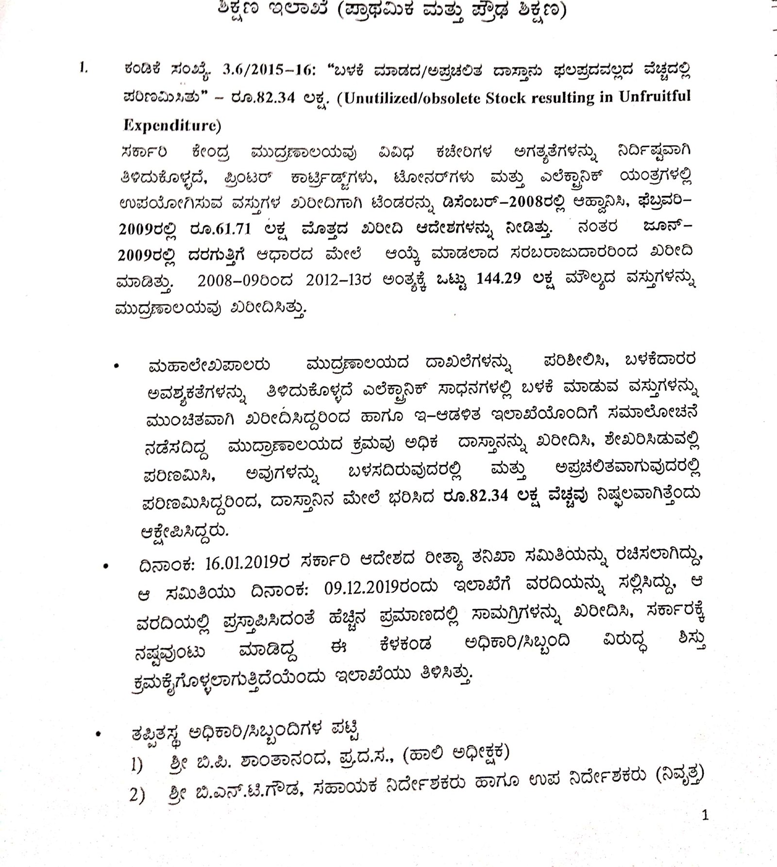 ಪ್ರಕರಣದ ಕುರಿತು ಮುದ್ರಣಾಲಯದ ದಾಖಲೆಗಳನ್ನು ಪರಿಶೀಲಿಸಿದ್ದ ಸಿಎಜಿಯು ಬಳಕೆದಾರರ ಅವಶ್ಯಕತೆಗಳನ್ನು ತಿಳಿದುಕೊಳ್ಳದೆಯೇ ಮತ್ತು ಇ-ಆಡಳಿತ ಇಲಾಖೆಯೊಂದಿಗೆ ಸಮಾಲೋಚಿಸದೆಯೇ ಕಂಪ್ಯೂಟರ್ ಸೇರಿದಂತೆ ಎಲೆಕ್ಟ್ರಾನಿಕ್ ಸಾಧನಗಳನ್ನು ಖರೀದಿಸಿತ್ತು. ಆದರೆ ಅವುಗಳನ್ನು ಬಳಕೆ ಮಾಡಿರಲಿಲ್ಲ. ಮುದ್ರಣಾಲಯದ ಕ್ರಮವು ಅಧಿಕ ದಾಸ್ತಾನನ್ನು ಖರೀದಿಸಿ ಶೇಖರಿಸಿಡಲಾಗಿತ್ತು. ಎಲೆಕ್ಟ್ರಾನಿಕ್ ಉಪಕರಣಗಳನ್ನು ಬಳಕೆ ಮಾಡದ ಕಾರಣ ದಾಸ್ತಾನಿನ ಮೇಲೆ ಭರಿಸಿದ್ದ 82.44 ಲಕ್ಷ ವೆಚ್ಚವು ನಿಷ್ಫಲವಾಗಿತ್ತು ಎಂದು ಸಿಎಜಿ ವರದಿಯಲ್ಲಿ ವಿವರಿಸಲಾಗಿತ್ತು.