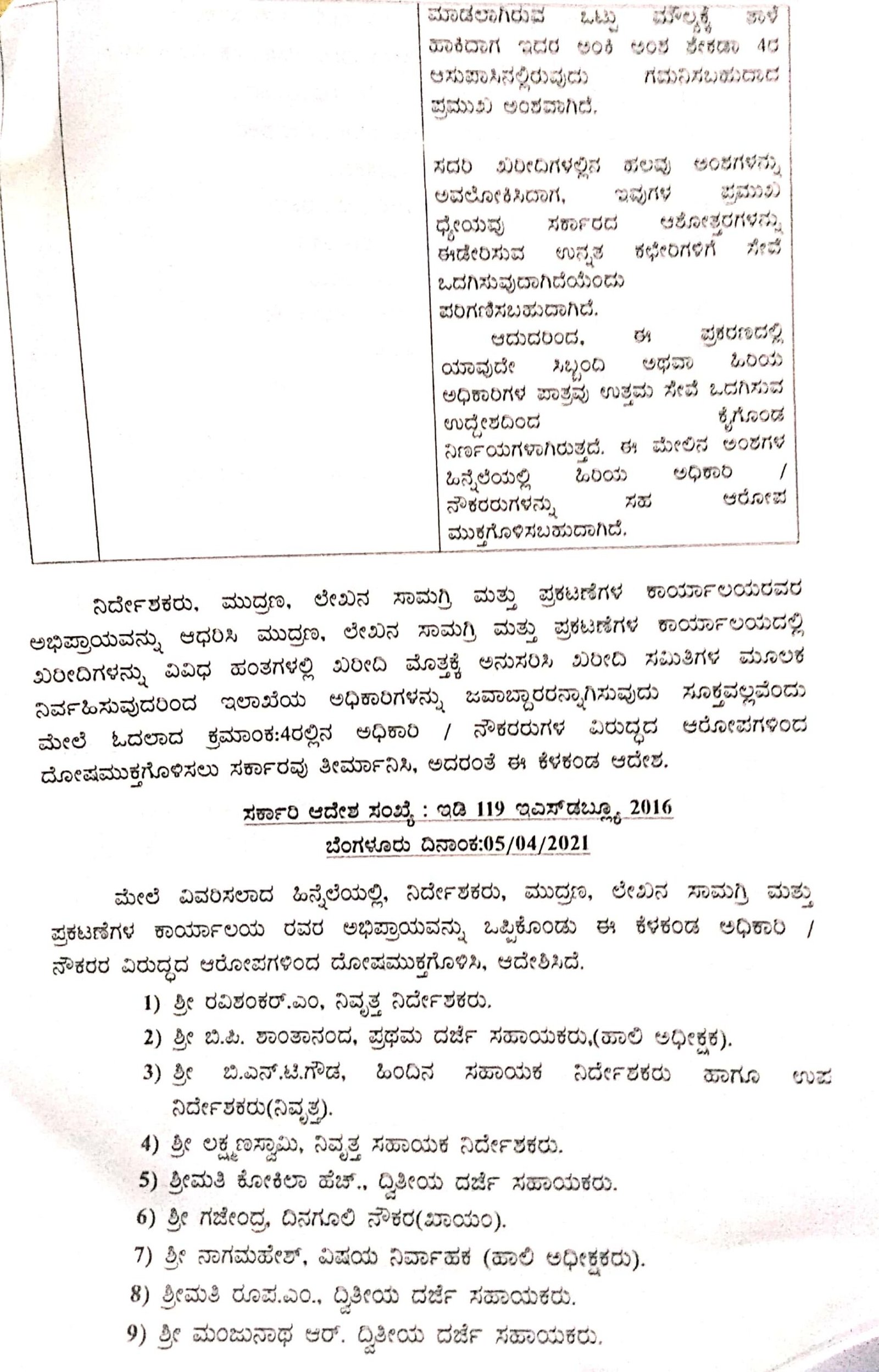 ಅಲ್ಲದೆ ಪ್ರಕರಣದಲ್ಲಿ ಆರೋಪಕ್ಕೆ ಗುರಿಯಾಗಿದ್ದ ಸರ್ಕಾರಿ ಮುದ್ರಣ, ಲೇಖನ ಸಾಮಗ್ರಿ ಕಾರ್ಯಾಲಯದ ಕಾರಣರಾದ ಐಎಎಸ್ ಅಧಿಕಾರಿ ರವಿಶಂಕರ್ (ಈಗ ನಿವೃತ್ತರು) ಸೇರಿದಂತೆ ಒಟ್ಟು 20 ಅಧಿಕಾರಿ, ನೌಕರರ ವಿರುದ್ಧ ಕ್ರಮ ಕೈಗೊಳ್ಳದೆಯೇ ಇಲಾಖೆಯು ಅವರೆಲ್ಲರನ್ನೂ ದೋಷಮುಕ್ತಗೊಳಿಸಿ ಆದೇಶ ಹೊರಡಿಸಿದೆ. ಆರೋಪಿಗಳನ್ನು ದೋಷಮುಕ್ತಗೊಳಿಸಲು ಸಚಿವ ಎಸ್ ಸುರೇಶ್ಕುಮಾರ್ ಅವರು ಅನುಮೋದಿಸಿದ್ದಾರೆ ಎಂದು ತಿಳಿದು ಬಂದಿದೆ.