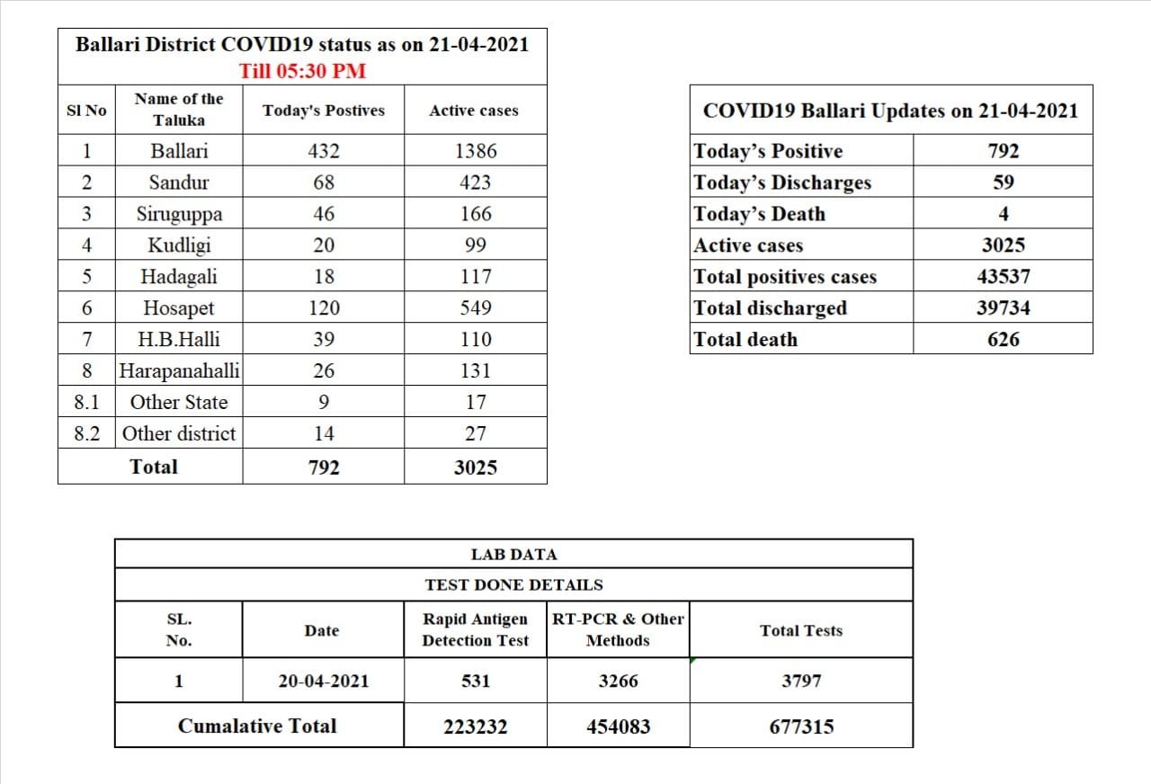 ಕೋವಿಡ್-19 ಸೋಂಕಿತ ಪ್ರಕರಣಗಳು ಬಳ್ಳಾರಿ ಜಿಲ್ಲೆಯಲ್ಲಿ 2021ರ ಏಪ್ರಿಲ್ 21ರ ಅಂತ್ಯಕ್ಕೆ 792 ಪ್ರಕರಣಗಳು ಒಂದೇ ದಿನದಲ್ಲಿ ದಾಖಲಾಗಿವೆ. ಈ ಪೈಕಿ ಬಳ್ಳಾರಿ ನಗರವೊಂದರಲ್ಲೇ 432 ಪ್ರಕರಣಗಳು ಕೋವಿಡ್ ದೃಢಪಟ್ಟಿವೆ. ಅಲ್ಲದೆ ನಗರದಲ್ಲಿ 1,386 ಪ್ರಕರಣಗಳು ಸಕ್ರಿಯವಾಗಿವೆ. ಜಿಲ್ಲೆಯಲ್ಲಿ ಈವರೆವಿಗೆ ಒಟ್ಟು 45,537 ಪ್ರಕರಣಗಳು ಕೋವಿಡ್ ದೃಢಪಟ್ಟಿವೆ. ಅಲ್ಲದೆ ಇನ್ನು 3,023 ಪ್ರಕರಣಗಳು ಸಕ್ರಿಯವಾಗಿವೆ. ಜಿಲ್ಲೆಯಲ್ಲಿ ಇದುವರೆಗೆ 626 ಮಂದಿ ಕೋವಿಡ್ನಿಂದಾಗಿ ಸಾವನ್ನಪ್ಪಿದ್ದಾರೆ.