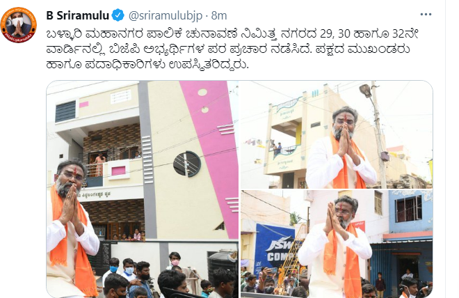 ಬೆಂಗಳೂರು; ಕೋವಿಡ್ 2ನೇ ಅಲೆಯ ತೀವ್ರತೆಯನ್ನು ತಡೆಗಟ್ಟಲು ಮುನ್ನೆಚ್ಚರಿಕೆ ಕ್ರಮ ವಹಿಸಬೇಕಿದ್ದ ಆರೋಗ್ಯ ಇಲಾಖೆಯ ಸಚಿವರಾಗಿದ್ದ ಹಾಲಿ ಸಮಾಜ ಕಲ್ಯಾಣ ಸಚಿವ ಬಿ ಶ್ರೀರಾಮುಲು ಅವರು ಮಾಸ್ಕ್ ಧರಿಸದೆಯೇ ಬಳ್ಳಾರಿಯ ಮಹಾನಗರಪಾಲಿಕೆ ಚುನಾವಣೆ ಪ್ರಚಾರದಲ್ಲಿ ಭಾಗಿಯಾಗಿದ್ದಾರೆ. ಕೋವಿಡ್ ಮಾರ್ಗಸೂಚಿಗಳನ್ನು ಶ್ರೀರಾಮುಲು ಉಲ್ಲಂಘಿಸುತ್ತಿದ್ದರೂ ಜಿಲ್ಲಾಧಿಕಾರಿ ಮತ್ತು ಜಿಲ್ಲಾ ರಕ್ಷಣಾಧಿಕಾರಿಗಳು ಮೌನ ವಹಿಸುವ ಮೂಲಕ ಕರ್ತವ್ಯಲೋಪ ಆರೋಪಕ್ಕೆ ಗುರಿಯಾಗಿದ್ದಾರೆ.
