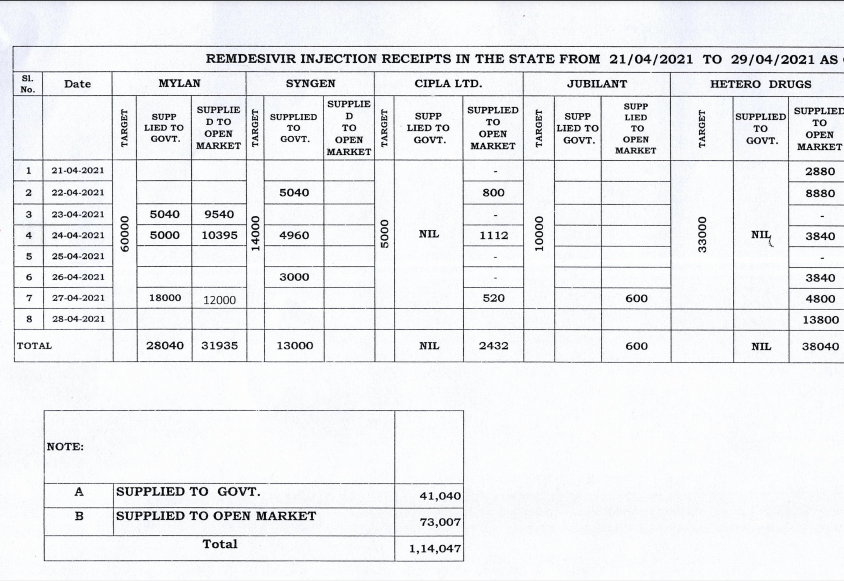 ಏಪ್ರಿಲ್ 21ರಿಂದ 28ರವರೆಗೆ ಈ ಎಲ್ಲಾ ಕಂಪನಿಗಳು ಸರ್ಕಾರಕ್ಕೆ 41,040 ಸರಬರಾಜು ಮಾಡಿದ್ದರೆ ಮುಕ್ತ ಮಾರುಕಟ್ಟೆಗೆ 59,207 ಚುಚ್ಚುಮದ್ದು ಸರಬರಾಜು ಆಗಿದೆ. ಸರ್ಕಾರಕ್ಕೆ ಒಂದೇ ಒಂದು ಔಷಧ ನೀಡದ ಜ್ಯುಬಿಲಿಯೆಂಟ್ ಕಂಪನಿಯು ಏಪ್ರಿಲ್ 27ರಂದು 600 ವಯಲ್ಗಳನ್ನು ಮುಕ್ತ ಮಾರುಕಟ್ಟೆಗೆ ಸರಬರಾಜು ಮಾಡಿದೆ. ಆ ನಂತರ ಸರ್ಕಾರ ಮತ್ತು ಮುಕ್ತ ಮಾರುಕಟ್ಟೆಗೆ ಒಂದೇ ಒಂದು ಚುಚ್ಚುಮದ್ದನ್ನು ಸರಬರಾಜು ಮಾಡಿಲ್ಲ. ಅದೇ ರೀತಿ ಸಿಪ್ಲಾ ಕಂಪನಿಯು ಸಹ ಒಟ್ಟು 2,432, ಸರಬರಾಜು ಮಾಡಿದೆ. ಮೈಲಾನ್ ಕಂಪನಿಯು ಮುಕ್ತ ಮಾರುಕಟ್ಟೆಗೆ 31,935 (ಸರ್ಕಾರಕ್ಕೆ 28,040), ಸಿನ್ಜಿನ್ 13,000 ಪೂರೈಕೆ ಮಾಡಿದೆ.