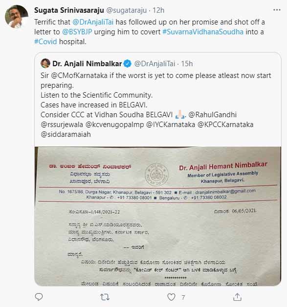 ಈ ಟ್ವೀಟ್‌ ಪ್ರಕಟಿಸುತ್ತಿದ್ದಂತೆ ಕಾಂಗ್ರೆಸ್‌ ಸೇರಿದಂತೆ ಹಲವು ಶಾಸಕರು ಇದೊಂದು ಉತ್ತಮವಾದ ಸಲಹೆ ಎಂದು ಅಭಿಪ್ರಾಯಿಸಿದ್ದಾರಲ್ಲದೆ ಟ್ವೀಟ್‌ ಕೂಡ ಮಾಡಿದ್ದಾರೆ. ಕಾಂಗ್ರೆಸ್‌ನ ಶಾಸಕಿ ಡಾ ಅಂಜಲಿ ನಿಂಬಾಳ್ಕರ್‌ ಈ ಕುರಿತು ಮುಖ್ಯಮಂತ್ರಿ ಯಡಿಯೂರಪ್ಪ ಅವರಿಗೆ ಪತ್ರವನ್ನೂ ಬರೆದಿದ್ದಾರೆ. ಬೆಳಗಾವಿಯಲ್ಲಿರುವ ಸುವರ್ಣ ವಿಧಾನಸೌಧವನ್ನು  ಕೋವಿಡ್‌ ಕೇರ್‌ ಸೆಂಟರ್‌ನ್ನಾಗಿ ಬಳಕೆ ಮಾಡಿಕೊಳ್ಳಿ ಎಂದು ಪತ್ರದಲ್ಲಿ ಪ್ರಸ್ತಾಪಿಸಿದ್ದಾರೆ.