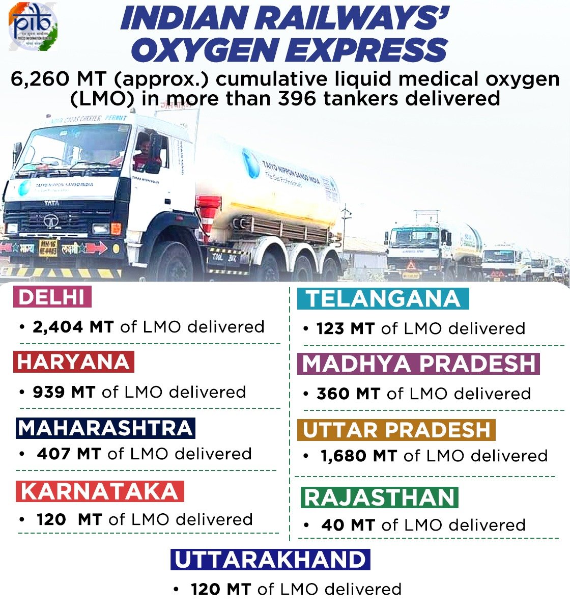 ಮೇ 12ರಂದು 396 ಟ್ಯಾಂಕರ್ಗಳ ಮೂಲಕ 6,260 ಮೆ.ಟನ್ ವೈದ್ಯಕೀಯ ಅಮ್ಲಜನಕವನ್ನು 9 ರಾಜ್ಯಗಳಿಗೆ ಹಂಚಿಕೆಮಾಡಿದೆ. ಇದರಲ್ಲಿ ದೆಹಲಿಗೆ 2,404 ಮೆಟ್ರಿಕ್ ಟನ್, ಹರ್ಯಾಣಕ್ಕೆ 939, ಮಹಾರಾಷ್ಟ್ರಕ್ಕೆ 407, ತೆಲಂಗಾಣಕ್ಕೆ 123, ಮಧ್ಯಪ್ರದೇಶಕ್ಕೆ 360, ರಾಜಸ್ಥಾನಕ್ಕೆ 40, ಉತ್ತರಾಖಂಡ್ಗೆ 120, ಉತ್ತರ ಪ್ರದೇಶಕ್ಕೆ 1,680 ಮತ್ತು ಕರ್ನಾಟಕಕ್ಕೆ 120 ಮೆಟ್ರಿಕ್ ಟನ್ ಹಂಚಿಕೆ ಮಾಡಿದೆ.