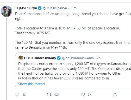 ಇದಕ್ಕೆ ಟ್ವೀಟ್ ಮೂಲಕ ಉತ್ತರಿಸಿರುವ ಬೆಂಗಳೂರು ದಕ್ಷಿಣ ಸಂಸದ ತೇಜಸ್ವಿ ಸೂರ್ಯ ಅವರು ರಾಜ್ಯಕ್ಕೆ 1,015 ಮೆಟ್ರಿಕ್ ಟನ್ ಮತ್ತು ವಿಶೇಷ ಹಂಚಿಕೆ ರೂಪದಲ್ಲಿ 60 ಮೆ.ಟನ್ ಸೇರಿ ಒಟ್ಟು 1,075 ಮೆ.ಟನ್ ಆಕ್ಸಿಜನ್ ಹಂಚಿಕೆ ಮಾಡಿದೆ. 120 ಮೆಟ್ರಿಕ್ ಟನ್ ಹಂಚಿಕೆಯಾಗಿರುವುದು ಆಕ್ಸಿಜನ್ ಎಕ್ಸ್ಪ್ರೆಸ್ವೊಂದರಿಂದ ಎಂದು ಉತ್ತರಿಸಿದ್ದಾರೆ.