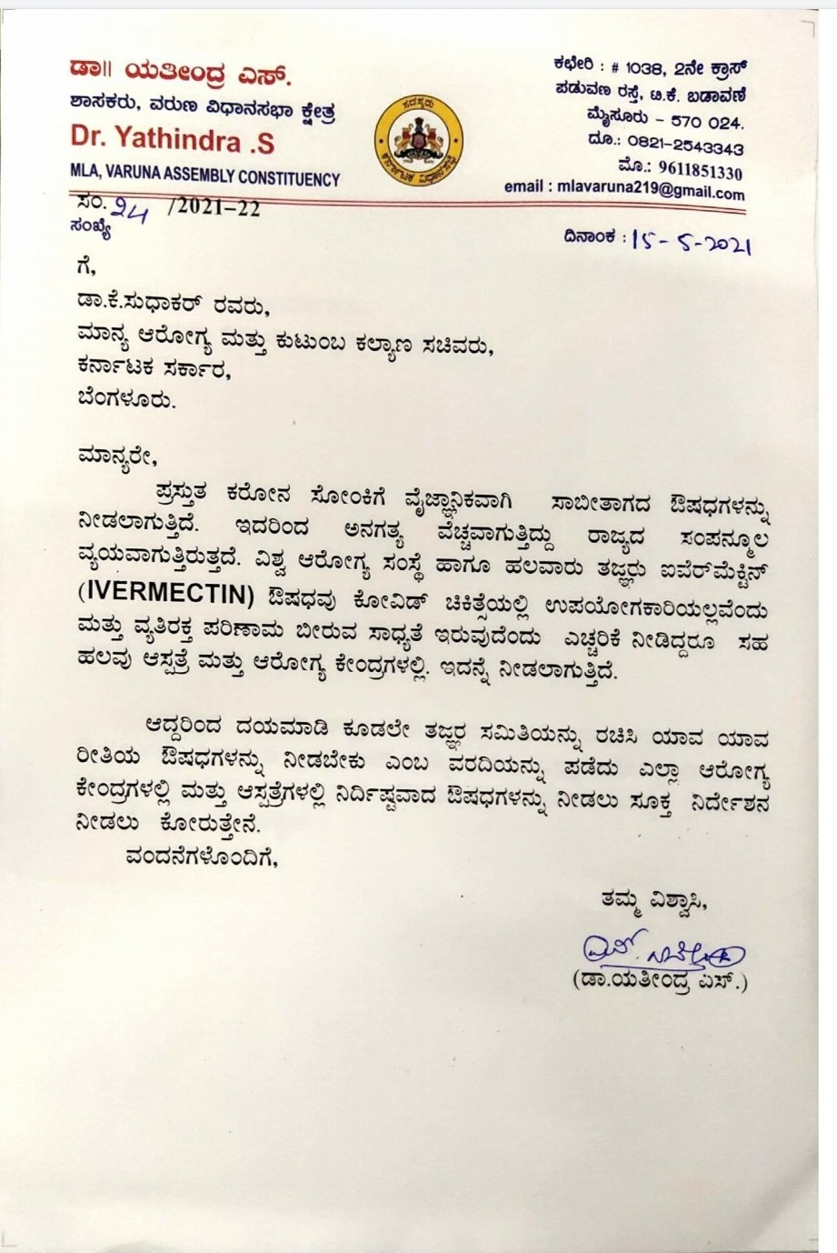 ಈ ಸಂಬಂಧ ವರುಣ ಕ್ಷೇತ್ರದ ಶಾಸಕ ಡಾ ಯತೀಂದ್ರ ಸಿದ್ದರಾಮಯ್ಯ ಅವರು ಆರೋಗ್ಯ ಮತ್ತು ಕುಟುಂಬ ಕಲ್ಯಾಣ ಸಚಿವ ಡಾ ಕೆ ಸುಧಾಕರ್ ಅವರಿಗೆ ಪತ್ರ ಬರೆದಿದ್ದಾರೆ. ‘ಕೋವಿಡ್ ಚಿಕಿತ್ಸೆಯಲ್ಲಿ ಉಪಯೋಗಕಾರಿಯೆಂದು ವೈಜ್ಞಾನಿಕವಾಗಿ ಧೃಡಪಟ್ಟಿಲ್ಲದ ಔಷಧಿಗಳನ್ನು ನಮ್ಮ ಸರ್ಕಾರಿ ಆರೋಗ್ಯ ಕೇಂದ್ರಗಳಲ್ಲಿ ಬಳಸಲಾಗುತ್ತಿದೆ. ಇದರಿಂದ ಅನಗತ್ಯ ಖರ್ಚಿನೊಂದಿಗೆ ರೋಗಿಗಳಿಗೆ ವ್ಯತಿರಿಕ್ತ ಪರಿಣಾಮಗಳೂ ಉಂಟಾಗುತ್ತದೆ. ಐವರ್ಮೆಕ್ಟಿನ್ ಮಾತ್ರೆ ಬಳಸದಂತೆ ವಿಶ್ವ ಆರೋಗ್ಯಸಂಸ್ಥೆಯೆ ಸೂಚಿಸಿದ್ದರೂ ನಮ್ಮಲ್ಲಿ ಇದನ್ನು ಬಳಸುತ್ತಿದ್ದಾರೆ. ಹಾಗಾಗಿ ಸರ್ಕಾರ ತಜ್ಞರ ಸಮಿತಿಯೊಂದನ್ನು ರಚಿಸಿ, ಅದರ ಸಲಹೆಯಂತೆ ಕೋವಿಡ್ ಚಿಕಿತ್ಸೆಯಲ್ಲಿ ಸರಿಯಾದ ಔಷಧಿಗಳನ್ನು ಬಳಸಲು ಮಾರ್ಗಸೂಚಿಯೊಂದನ್ನು ರೂಪಿಸಬೇಕು,’ ಎಂದು ಪತ್ರದಲ್ಲಿ ತಿಳಿಸಿದ್ದಾರೆ.