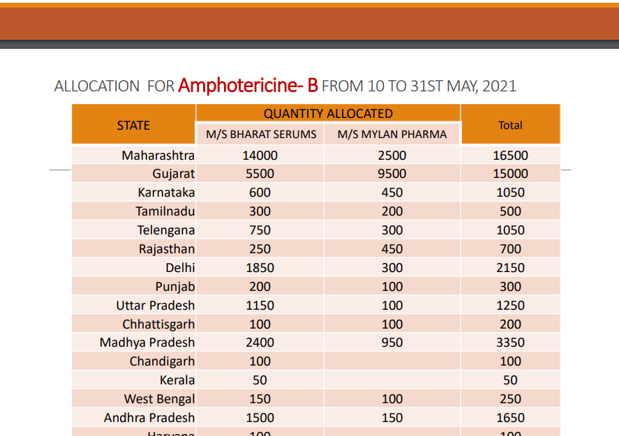 ಕೇಂದ್ರ ಆರೋಗ್ಯ ಸಚಿವಾಲಯದ ಮಾಹಿತಿ ಪ್ರಕಾರ ಮಹಾರಾಷ್ಟ್ರ ಮತ್ತ ಗುಜರಾತ್‌ಗೆ ಹೆಚ್ಚು ಹಂಚಿಕೆ ಮಾಡಿದೆ. ಮಹಾರಾಷ್ಟ್ರಕ್ಕೆ 16,500 ಮತ್ತು ಗುಜರಾತ್‌ಗೆ 15,000 ಹಂಚಿಕೆ ಮಾಡಿದೆ. ರಾಜ್ಯದಲ್ಲಿಯೂ ಬ್ಲಾಕ್‌ ಫಂಗಸ್‌ ಹರಡುವಿಕೆ ಪ್ರಮಾಣವೂ ಹೆಚ್ಚಾಗುವ ಮೂಲಕ ಆತಂಕ ಮೂಡಿದ್ದರೂ ಕೇಂದ್ರ ಸರ್ಕಾರವು ಮೇ 31ರವರೆಗೆ ಕೇವಲ 1,050 ವಯಲ್‌ಗಳನ್ನಷ್ಟೇ ಹಂಚಿಕೆ ಮಾಡಿದೆ.