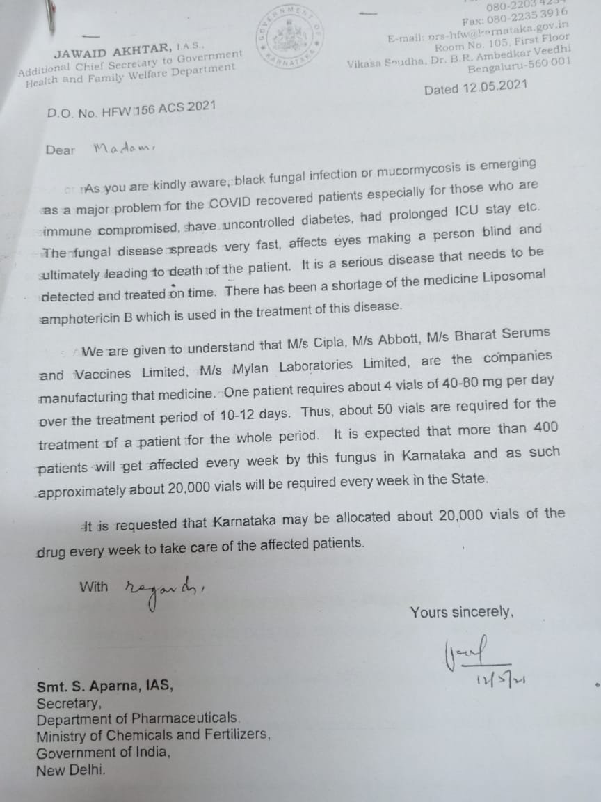 ಭಾರತ್‌ ಸಿರಮ್ಸ್‌ ಮತ್ತು ಮೈಲಾನ್‌ ಫಾರ್ಮಾ ಕಂಪನಿಗಳು ತಯಾರಿಸಿರುವ ಆಂಪೋಟೆರಿಸಿನ್ ಬಿ ಔಷಧವನ್ನು ಮೇ 31ರವರೆಗೆ ಒಟ್ಟು 44,250 ವಯಲ್ ಹಂಚಿಕೆ ಮಾಡಿದೆಯಾದರೂ ಕರ್ನಾಟಕದ ಬೇಡಿಕೆಗೆ ತಕ್ಕಂತೆ ಈ ಔಷಧವನ್ನು ಹಂಚಿಕೆ ಮಾಡಿಲ್ಲ. ಆಂಪೋಟೆರಿಸಿನ್ ಬಿ ಔಷಧಕ್ಕೆ ರಾಜ್ಯ ಸರ್ಕಾರವು 20,000 ವಯಲ್‌ಗೆ ಬೇಡಿಕೆ ಇಟ್ಟಿತ್ತು. ಕೇಂದ್ರ ಸರ್ಕಾರ ಹಂಚಿಕೆ ಮಾಡಿದ್ದು ಕೇವಲ 1,050 ಮಾತ್ರ.