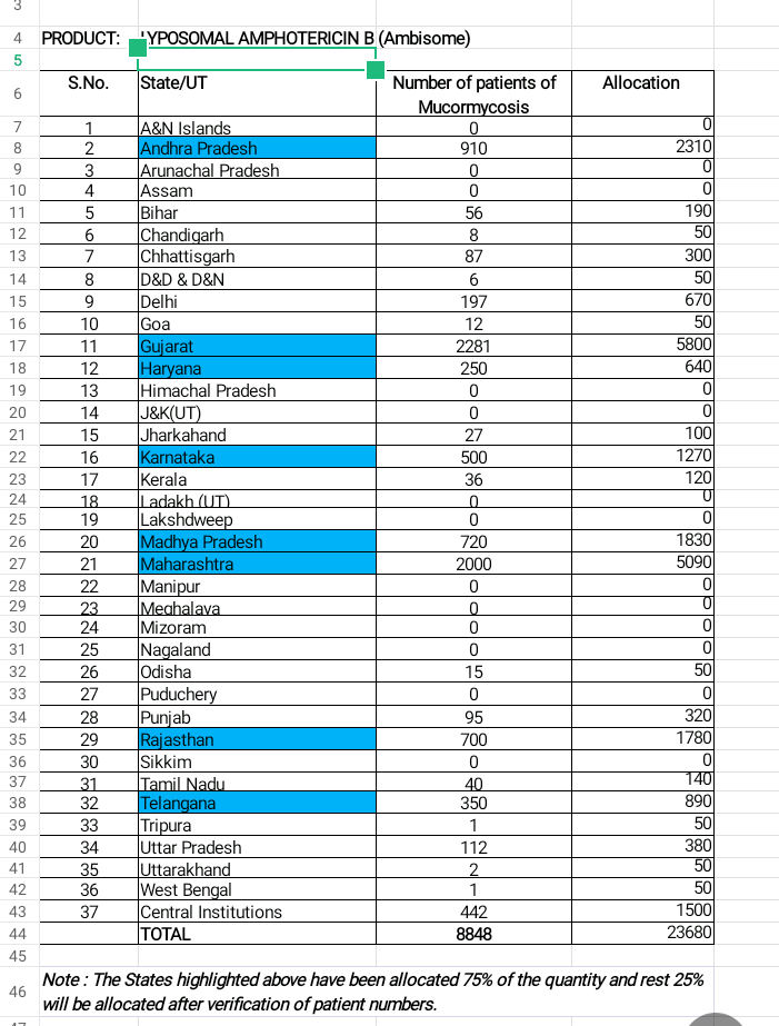 ಅತೀ ಹೆಚ್ಚು ಕಪ್ಪು ಶಿಲೀಂಧ್ರ ರೋಗಿಗಳು ಗುಜರಾತ್ನಲ್ಲಿ 2,281 ಇದ್ದಾರೆ. ಆ ರಾಜ್ಯಕ್ಕೆ 5,800 ವಯಲ್ಸ್ ಹಂಚಿಕೆ ಮಾಡಲಾಗಿದೆ. ಉಳಿದಂತೆ, ಮಹಾರಾಷ್ಟ್ರದಲ್ಲಿ 2,000 (5090), ಆಂಧ್ರಪ್ರದೇಶ 910 (2,310), ಮದ್ಯಪ್ರದೇಶ 720 (1830), ರಾಜಸ್ಥಾನ 700 (1780), ತೆಲಂಗಾಣ 350 (890), ಹರಿಯಾಣ 250 (640) ರೋಗಿಗಳಿದ್ದಾರೆ.