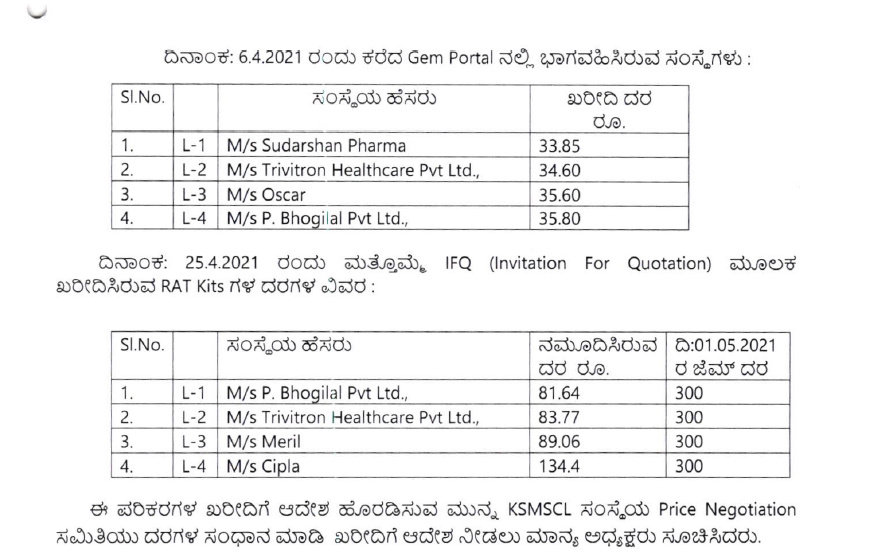 30 ಲಕ್ಷ ಪರೀಕ್ಷೆ ನಡೆಸಲು ರ್ಯಾಪಿಡ್ ಆ್ಯಂಟಿಜನ್ ಟೆಸ್ಟ್ (RAT) ಕಿಟ್ ಖರೀದಿಗಾಗಿ 2021ರ ಏಪ್ರಿಲ್ 6ರಂದು ಮೊದಲು ದರ ಪಟ್ಟಿ ಆಹ್ವಾನಿಸಿತ್ತು. ಆ ಸಂದರ್ಭದಲ್ಲಿ ಒಟ್ಟು 4 ಕಂಪನಿಗಳು ಭಾಗವಹಿಸಿದ್ದವು. ಸುದರ್ಶನ್ ಫಾರ್ಮಾ ತಲಾ ಟೆಸ್ಟ್ಗೆ 33.85 ರು. ನಮೂದಿಸಿತ್ತು. ಹಾಗೆಯೇ ಟ್ರಿವಿಟ್ರಾನ್ ಹೆಲ್ತ್ ಕೇರ್ ಪ್ರೈವೈಟ್ ಲಿಮಿಟೆಡ್ 34.60 ರು., ಓಸ್ಕರ್ 35.60 ರು., ಪಿ ಭೋಗಿಲಾಲ್ ಪ್ರೈವೈಟ್ ಲಿಮಿಟೆಡ್ 35.80 ರು ನಮೂದಿಸಿತ್ತು. ಇದರಲ್ಲಿ 33.85 ರು. ನಮೂದಿಸಿದ್ದ ಸುದರ್ಶನ್ ಫಾರ್ಮಾ ಕಂಪನಿಯು ಎಲ್-1 ಕಂಪನಿಯಾಗಿತ್ತು. ಎಲ್ 1 ಆಗಿ ಹೊರಹೊಮ್ಮಿದ್ದ ಕಂಪನಿಗೆ ಖರೀದಿ ಆದೇಶ ನೀಡಿದ್ದರೆ 10.15 ಕೋಟಿ ರು.ನಲ್ಲಿ 30 ಲಕ್ಷ ಟೆಸ್ಟ್ಗಳನ್ನು ನಡೆಸಬಹುದಿತ್ತು. ಆದರೆ ವೈದ್ಯಕೀಯ ಸರಬರಾಜು ನಿಗಮದ ಅಧಿಕಾರಿಗಳು ಈ ದರಪಟ್ಟಿಯನ್ನು ಅಂತಿಮಗೊಳಿಸಲಿಲ್ಲ.