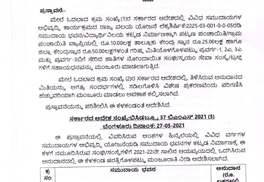 ಹಿಂದುಳಿದ ವರ್ಗಗಳ ಇಲಾಖೆಗಳ ವ್ಯಾಪ್ತಿಯಲ್ಲಿರುವ ವಿವಿಧ ಸಮುದಾಯಗಳ ಅಭಿವೃದ್ಧಿ ಕಾರ್ಯಕ್ರಮದ ಭಾಗವಾಗಿ ಸಮುದಾಯ ಭವನಗಳ ನಿರ್ಮಾಣವೂ ಸೇರಿದಂತೆ ಇನ್ನಿತರೆ ಉದ್ದೇಶಗಳಿಗಾಗಿ ಪಟ್ಟಣ ಪಂಚಾಯ್ತಿ, ಗ್ರಾಮ ಪಂಚಾಯ್ತಿ ವ್ಯಾಪ್ತಿಯಲ್ಲಿ 10 ಲಕ್ಷ, ತಾಲೂಕು ಕೇಂದ್ರ ಸ್ಥಾನದಲ್ಲಿ 25.00 ಲಕ್ಷ, ಜಿಲ್ಲಾ ಕೇಂದ್ರ ಸ್ಥಾನದಲ್ಲಿ 50 ಲಕ್ಷಗಳಂತೆ ಗರಿಷ್ಠ ಮಿತಿಗೊಳಪಟ್ಟು 10.60 ಕೋಟಿ ರು.ಗಳನ್ನು ಬಿಡುಗಡೆ ಮಾಡಿ 2021ರ ಮೇ 27ರಂದು ಆದೇಶ ಹೊರಡಿಸಿದೆ.