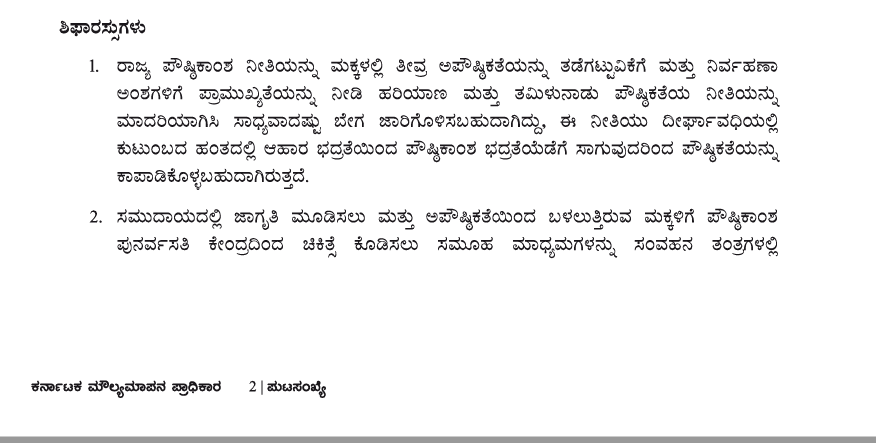 ರಾಜ್ಯವು ಕುಟುಂಬದ ಮಟ್ಟದಲ್ಲಿ ಆಹಾರ ಸುರಕ್ಷತೆಯ ಜತೆಗೆ ಪೌಷ್ಠಿಕಾಂಶ ಸುರಕ್ಷತೆಯನ್ನು ಖಾತ್ರಿಪಡಿಸುವ ಪೌಷ್ಠಿಕಾಂಶ ನೀತಿಯನ್ನು ಜಾರಿಗೊಳಿಸಬೇಕು ಎಂದು ಆರೋಗ್ಯ ನಿರ್ವಹಣಾ ಸಂಶೋಧನಾ ಸಂಸ್ಥೆ ಪ್ರಮುಖ ಶಿಫಾರಸ್ಸು ಮಾಡಿತ್ತು. ವರದಿ ಸಲ್ಲಿಕೆಯಾದ ನಂತರ ವಿಧಾನಸಭೆ ಮತ್ತು ವಿಧಾನಪರಿಷತ್ ಅಧಿವೇಶನ ನಡೆದಿದ್ದರೂ ಮಹಿಳಾ ಮತ್ತು ಮಕ್ಕಳ ಕಲ್ಯಾಣ ಇಲಾಖೆಯು ಪೌಷ್ಠಿಕಾಂಶ ನೀತಿ ಕುರಿತು ವಿಧಾನಮಂಡಲಕ್ಕೆ ಮಂಡಿಸುವ ಕುರಿತು ಮುಂದಾಗಿಲ್ಲ. ಈ ಕುರಿತು ಸಚಿವೆ ಶಶಿಕಲಾ ಜೊಲ್ಲೆ ಅವರು ಕೂಡ ಗಮನಹರಿಸಿಲ್ಲ ಎಂದು ಗೊತ್ತಾಗಿದೆ.