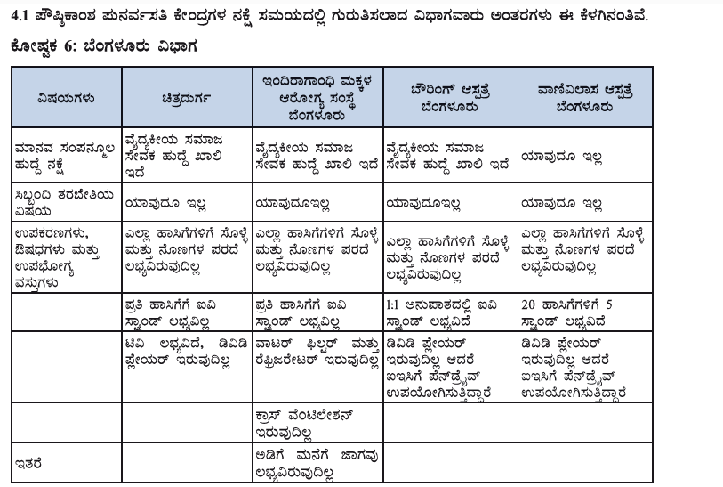 ಪೌಷ್ಠಿಕಾಂಶ ಪುನರ್ವಸತಿ ಕೇಂದ್ರಗಳ ಸಮೀಕ್ಷೆ ಸಂದರ್ಭದಲ್ಲಿ ಅಧ್ಯಯನ ತಂಡವು ವಿಭಾಗವಾರು ಅಂತರಗಳನ್ನು ಪತ್ತೆ ಹಚ್ಚಿದೆ. ಈ ಪೈಕಿ ಬೆಂಗಳೂರು ವಿಭಾಗದ ಚಿತ್ರದುರ್ಗ, ಇಂದಿರಾಗಾಂಧಿ ಮಕ್ಕಳ ಆರೋಗ್ಯ ಸಂಸ್ಥೆ, ಬೌರಿಂಗ್ ಆಸ್ಪತ್ರೆ, ವಾಣಿವಿಲಾಸ ಆಸ್ಪತ್ರೆಯಲ್ಲಿ ಎಲ್ಲಾ ಹಾಸಿಗೆಗಳಿಗೆ ಸೊಳ್ಳೆ ಮತ್ತು ನೊಣಗಳ ಪರದೆ ಲಭ್ಯವಿಲ್ಲ ಎಂದು ವರದಿ ಮಾಡಿದೆ. ಅಲ್ಲದೆ ಬೌರಿಂಗ್ ಆಸ್ಪತ್ರೆ ಹೊರತುಪಡಿಸಿ ಬೆಂಗಳೂರು ವಿಭಾಗದ ಇಂದಿರಾಗಾಂಧಿ ಮಕ್ಕಳ ಆರೋಗ್ಯ ಸಂಸ್ಥೆಯಲ್ಲಿ ಪ್ರತಿ ಹಾಸಿಗೆಗೆ ಐವಿ ಸ್ಟ್ಯಾಂಡ್, ವಾಟರ್ ಫಿಲ್ಟರ್, ರೆಫ್ರಿಜರೇಟರ್ ಕೂಡ ಇಲ್ಲ. ಮಾತ್ರವಲ್ಲದೆ ಅಡಿಗೆ ಮನೆಗೆ ಜಾಗವೂ ಲಭ್ಯವಿಲ್ಲ ಎಂದು ಹೇಳಿದೆ.