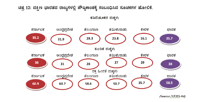 ತಮಿಳುನಾಡಿನಲ್ಲಿ ಕಡಿಮೆ ತೂಕ, ಕಡಿಮೆ ಎತ್ತರ ಮತ್ತು ಕುಕಂಠಿತ ಬೆಳವಣಿಗೆಯ ಅಂದಾಜು ಕ್ರಮವಾಗಿ ಶೇ.24, ಶೆ.27 ಮತ್ತು ಶೇ.28, ಕೇರಳದಲ್ಲಿ ಶೇ.16, ಶೇ.20 ಮತ್ತು ಶೇ.22 ಆಂಧ್ರಪ್ರದೇಶದಲ್ಲಿ ಕ್ರಮವಾಗಿ ಶೇ.31.9, ಶೇ.31 ಮತ್ತು ಶೇ.22, ದಕ್ಷಿಣ ಭಾರತದಲ್ಲಿ ನೆರೆಹೊರೆಯ ರಾಜ್ಯಗಳಿಗಿಂತ ಕರ್ನಾಟಕದಲ್ಲಿ ಶೇಕಡವಾರು ಅಪೌಷ್ಠಿಕತೆ ಪ್ರಮಾಣವು ಹೆಚ್ಚಿದೆ ಎಂದು ವರದಿಯಲ್ಲಿ ವಿಶ್ಲೇಷಿಸಲಾಗಿದೆ.